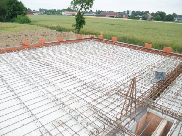 Fertigdecke auf EG, ohne Oberbewehrung, vorne Installationsschacht als Loch in der Decke