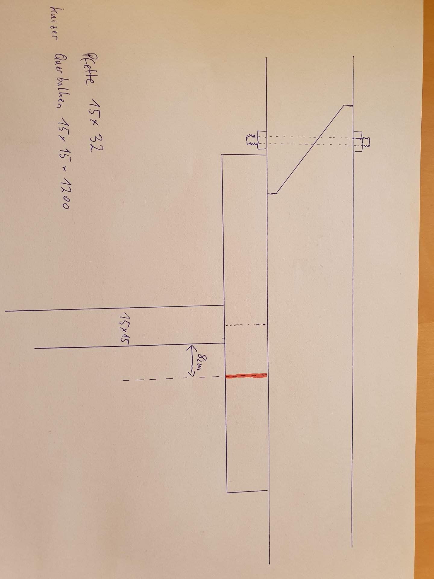 zu deiner Skizze: rechts vom abgestützten Balken bleiben noch ca 8cm überstand. Ich hätte Links davon nochmal einen 15x15 Balken hingestellt und mit Gewindestangen 3x zusammengeschraubt