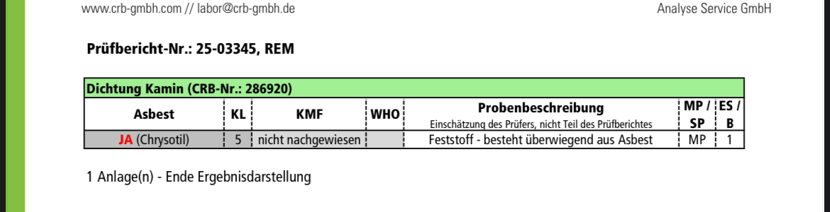 Diskutiere 50% Chrysotil (KL 5) im Kamin im Sanierung konkret Forum im Bereich Altbau; [ATTACH] Moin Leute, ich hat hier schon genervt, jetzt habe ich nochmal die Ehre. Habe Asbest im Kamin, siehe Fotos und Testbericht. Der Kamin...