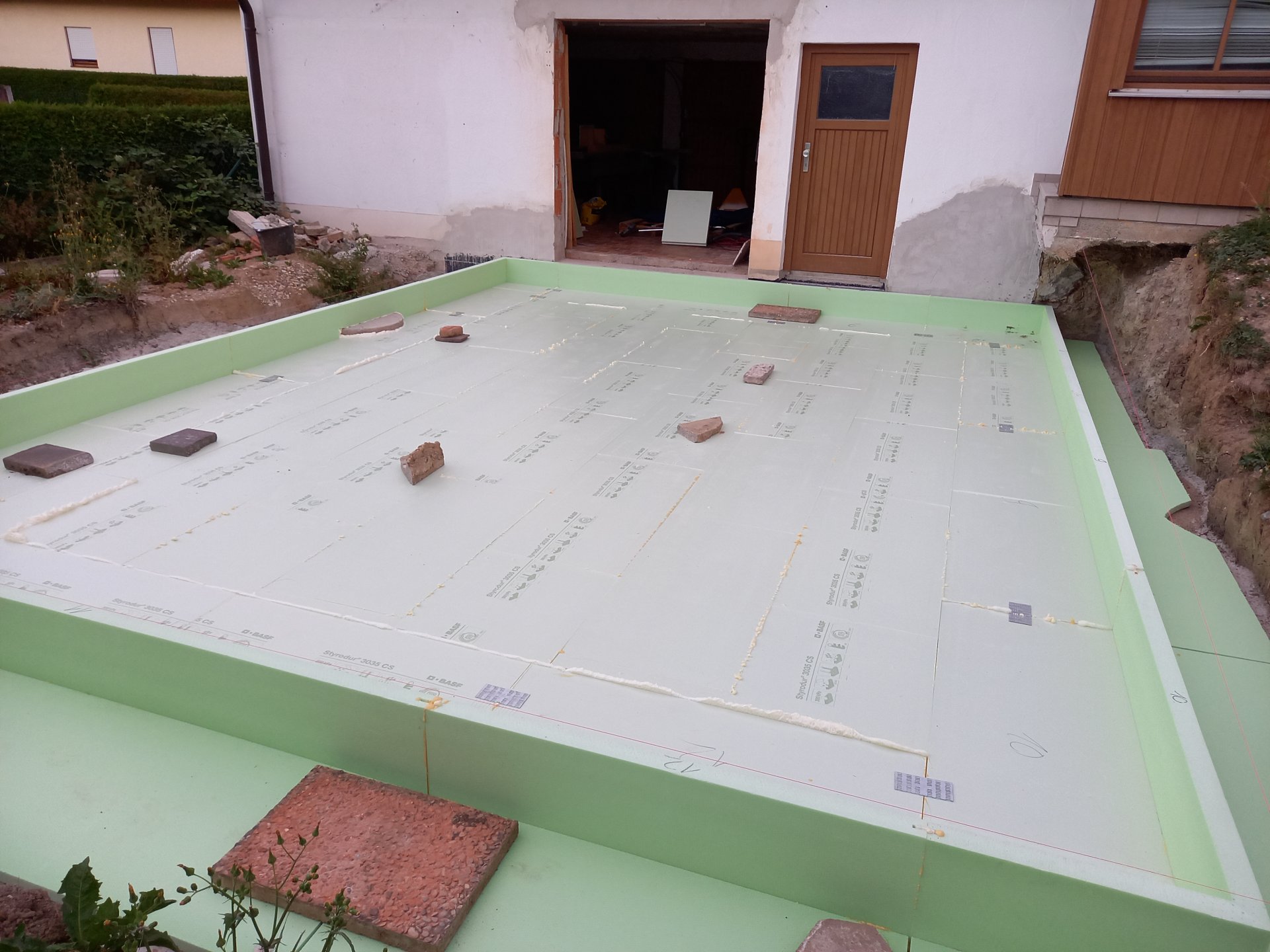 Bodenplatte Abdichtung: Hallo zusammen, habe ein Haus gekauft, Fertighaus BJ2022. Auf Bodenplatte. Warum auch immer ist er etwas „versenkt“ und die Putzunterkante ist... -