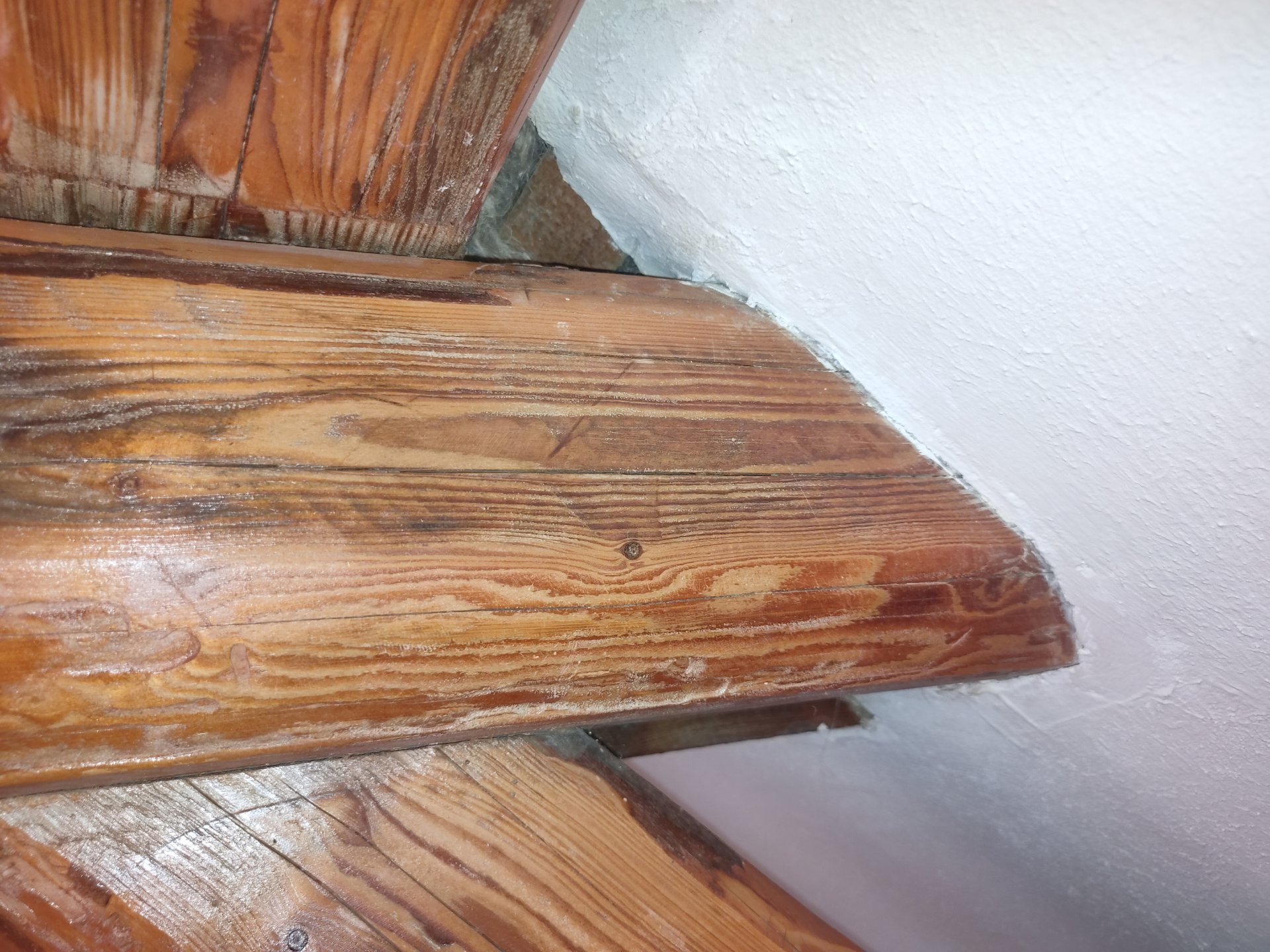 Dachbalken schwarz, direkt unter Dampfsperre - Dachsanierung 1992 Pfusch?: Hallo Expertenrunde! Die Fotos zeigen im Dachspitz Schwärzungen an der Oberseite der Dachbalken und auf der Dampfsperre zwischen den Balken. Man...