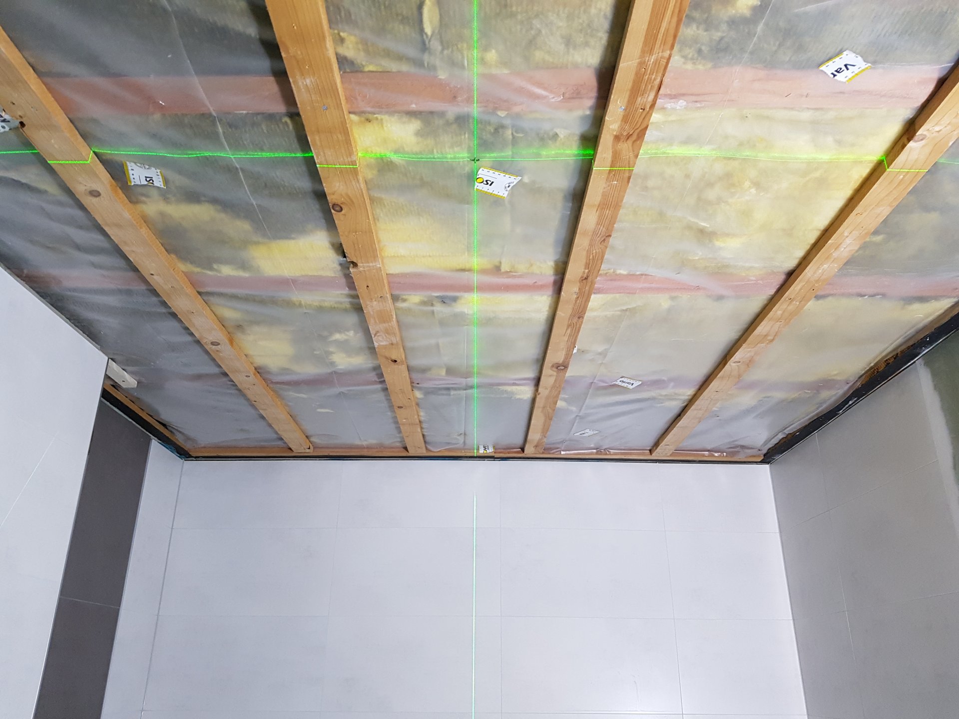 Diskutiere Abgehängte Gipskartondecke im Bad => Keine Betondecke vorhanden, nur Holzlatten (mit Bild) im Trockenbau Forum im Bereich Neubau; Hallo zusammen, ich möchte eine abgehängte Gipskartondecke im neu gefliesten Bad anbringen und darin 6 Einbauleuchten, 2 LED Panels (30x30 cm)...