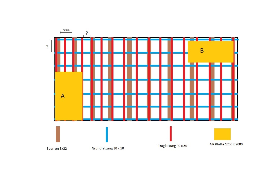 Mir geht es um den Abstand der Grund und Tragelattung sowie die Verlegerichtung von den Trockenbauplatten: