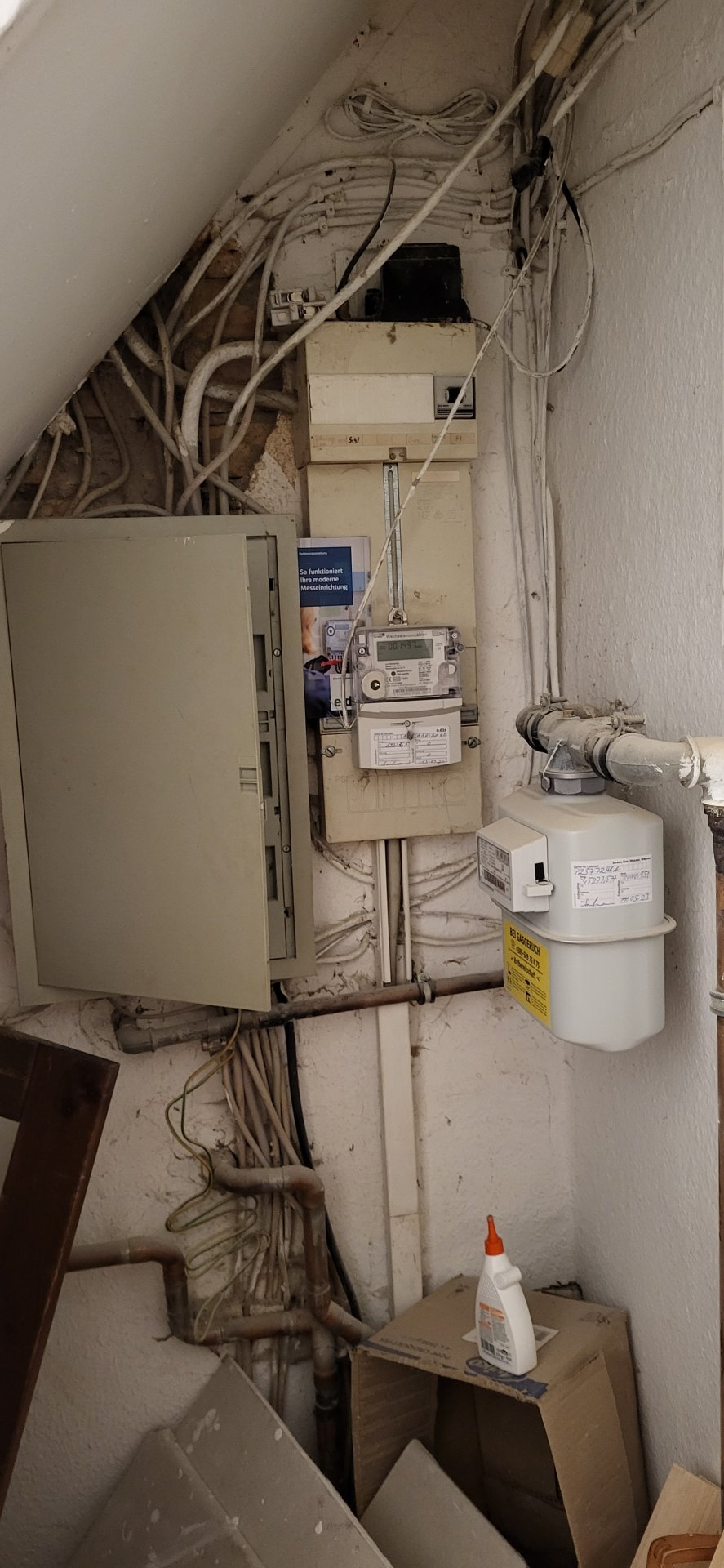 Das Haus ist aus den 50ern und der Sicherungskasten ist nahe am Gaszähler unter der Treppe verbaut.