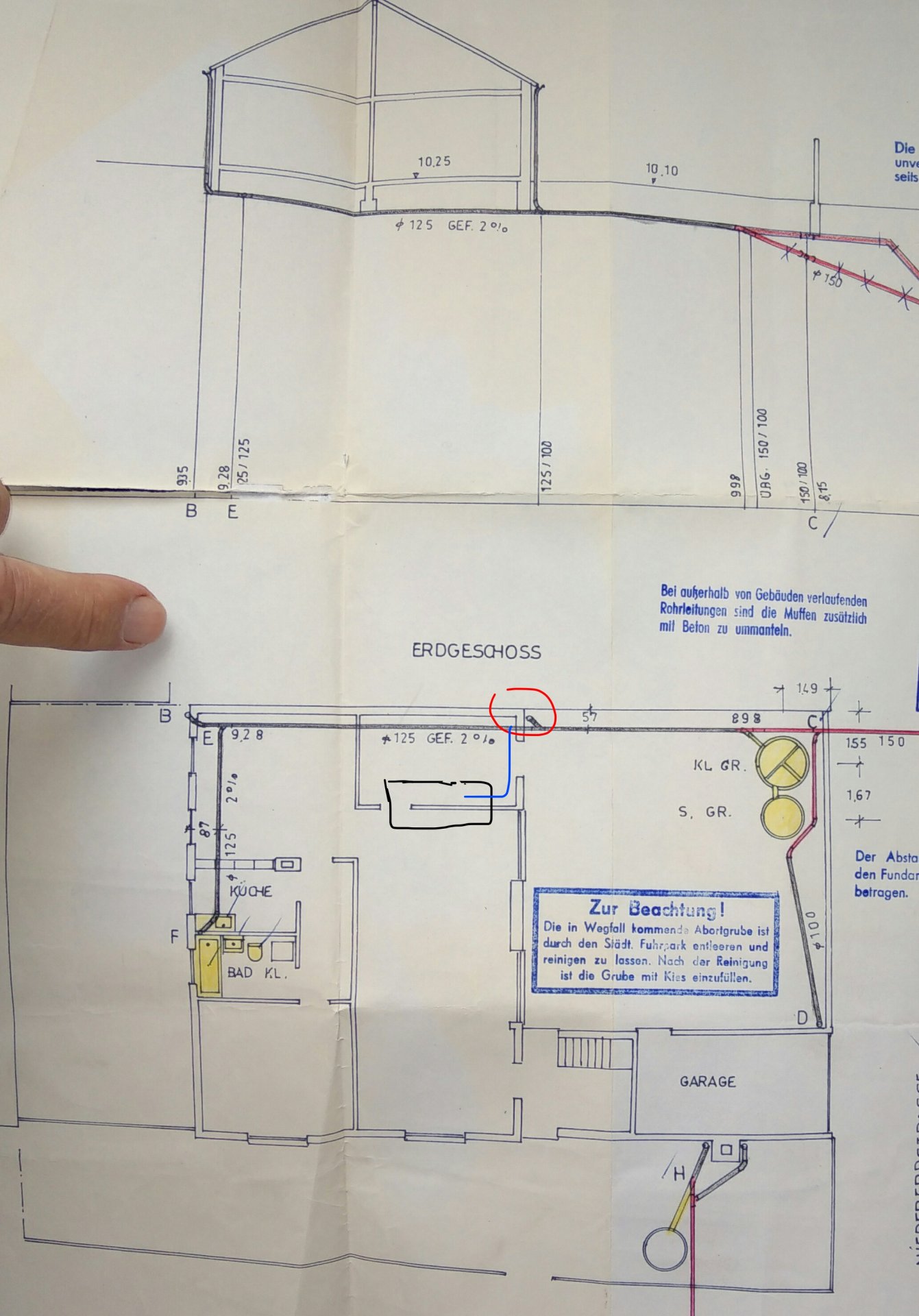 Verlegung Abwasserleitungen: Beschreibung:: - EG Wohnung liegt über Kanal und könnte direkt an den Kanal; ohne Hebeanlage; angebunden werden - KG Einliegerwohnung liegt unter... -