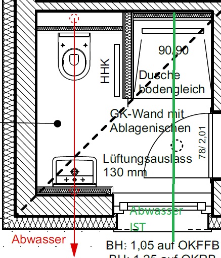 Die Trockenbauwand müsste dann allerdings neu gesetzt werden, da diese mit 90cm für WC und 99cm für Dusche gesetzt wurde.