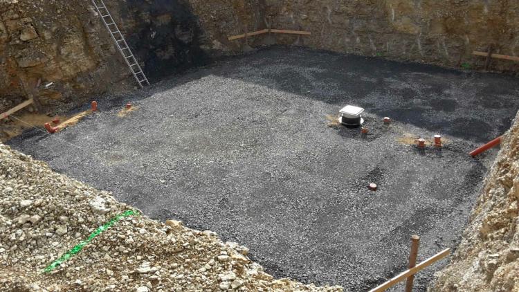 Abwasserrohr schaut etwas aus dem Schotter heraus (Keller), vor Betonierung