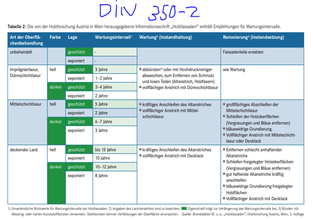 mit Wartungen ( siehe Bild VON DER DIN) und vor allem Konstruktiven Holzschutz - Tropfkanten und Hirnholschutz ( Porenfüller verwenden am Hirnholz) und Spritzwasserschutz oder Große Querschnitte vermeiden hält dir das Kiefer Holz naja ewig. die Blockhäuser ( finanzierbare) sind meist auch aus Kiefern-Holz..