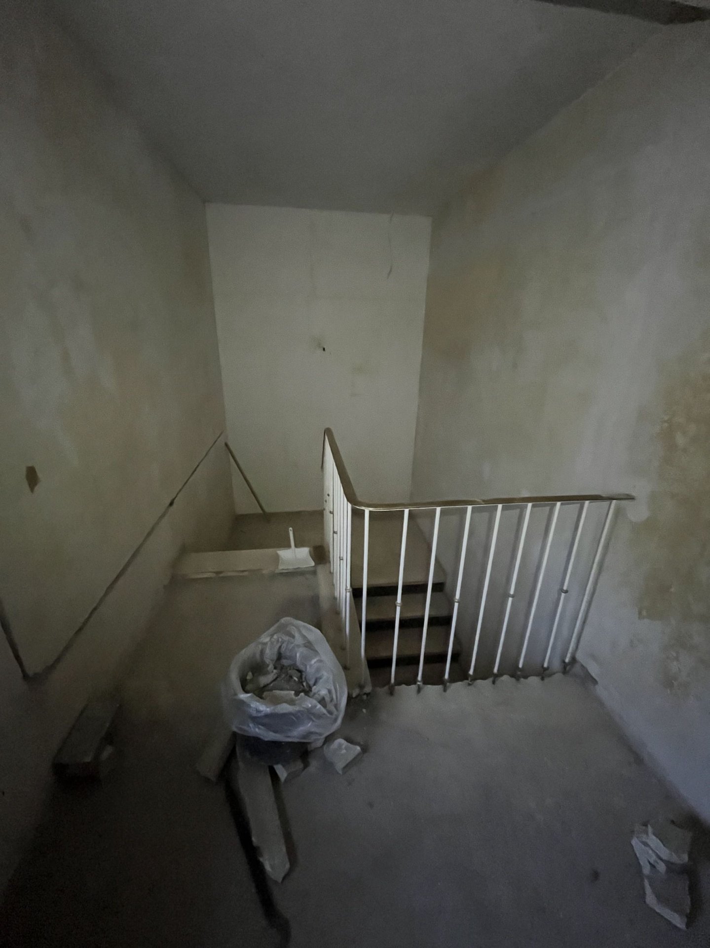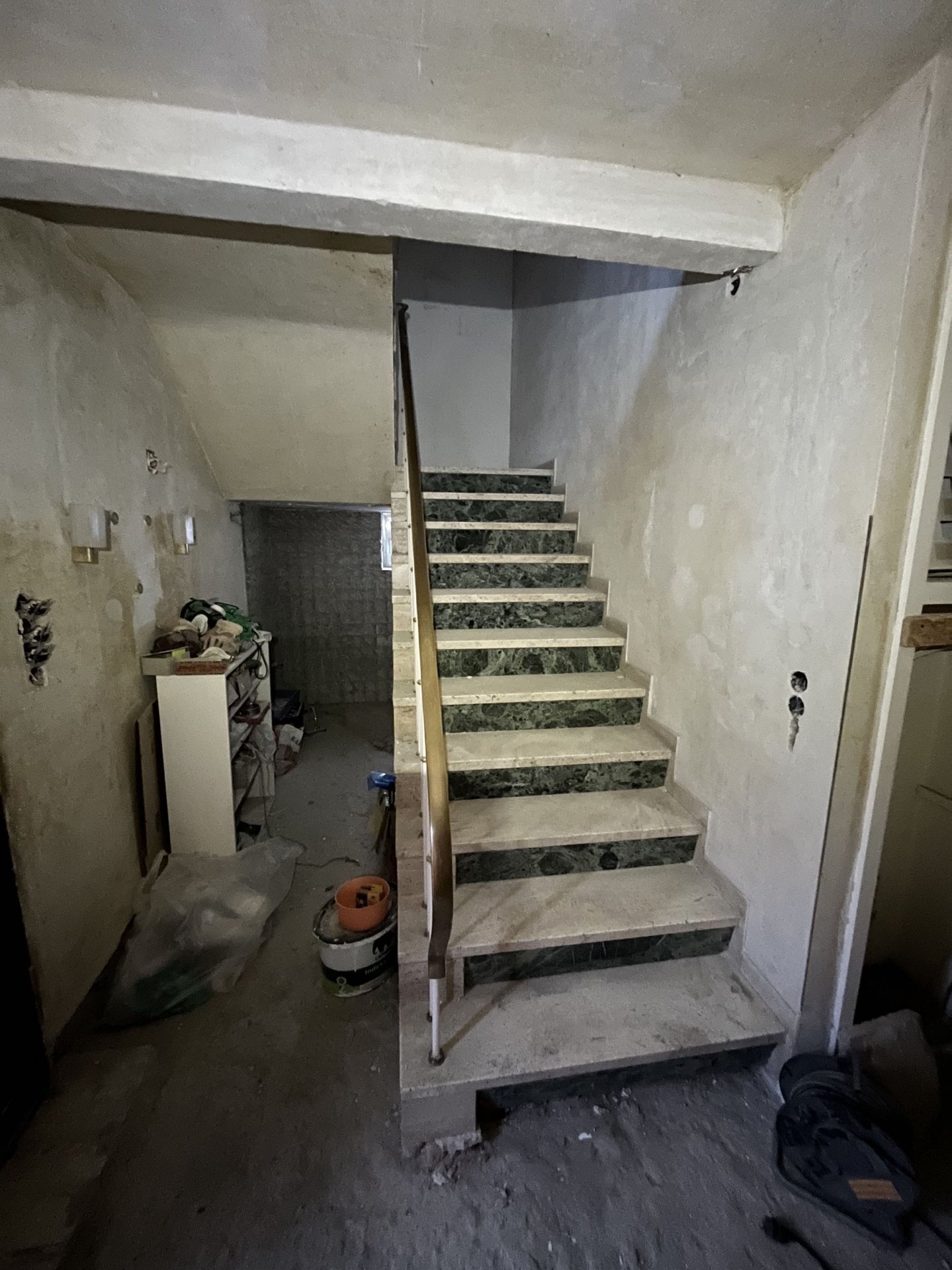 Diese Treppe bringt mich wirklich zur Verzweiflung. Der alteTreppenbelag ist nun weg, die Treppe war schon ganz ordentlich "aufgedoppelt". 4cm Marmor, darunter zwischen 2-3 Zentimeter Mörtel und auch der Auftritt war ca. 6 cm "nach vorne" verschoben. Das Entfernen hat die Kopffreiheitssituation unter dem Unterzug deutlich entschärft.