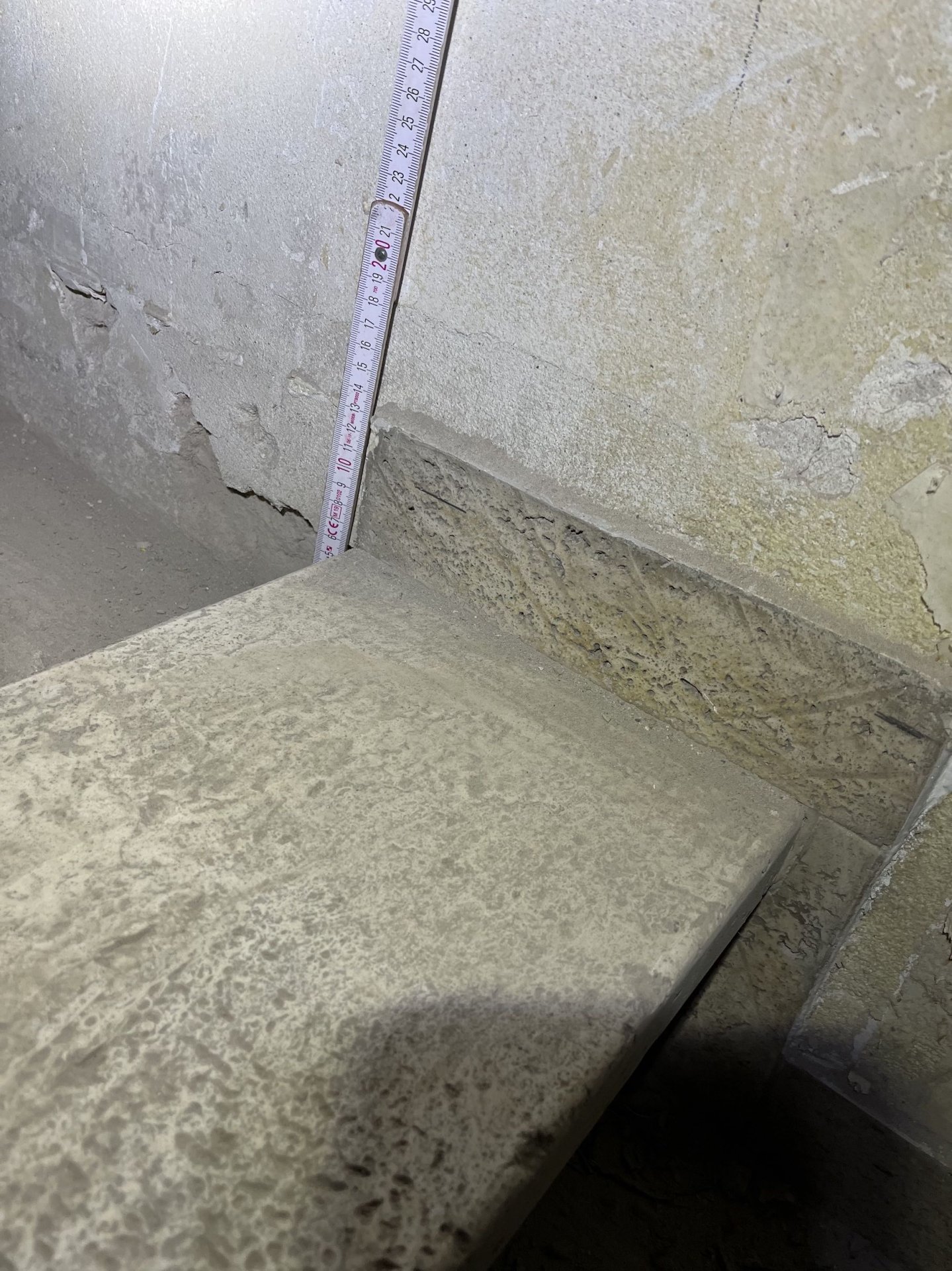 Ich habe heute Mittag aus Verzweiflung ein kleines Stück der untersten Stufe abgetragen, um zu sehen, ob ich irgendwo auf Bewehrung stoße. Da war nichts. Anschließend habe ich dann die folgenden Stufen genau durchgemessen und musste einsehen, dass es keinen Sinn ergibt, weitere 6-7 Stufen auch noch um 2-3 cm abzutragen.