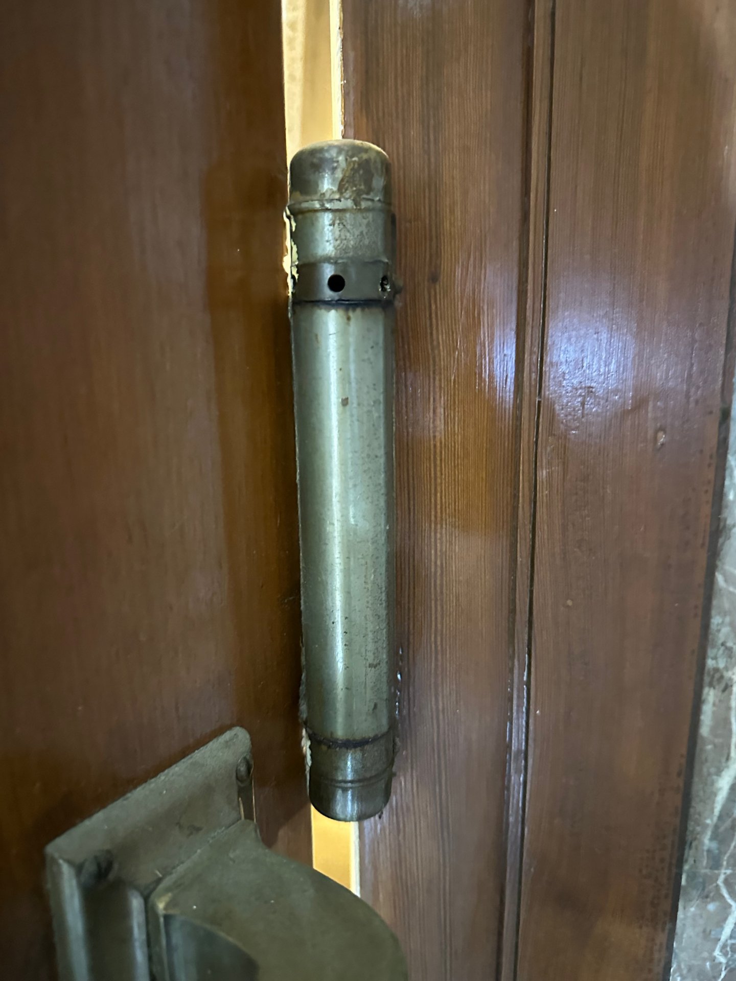 Alte Pendeltür Griffe demontieren: Hallo zusammen, vielleicht kennt sich ja hier jemand mit alten Pendeltüren / Schwingtüren aus. Bei uns in der Firma haben wir eine alte...