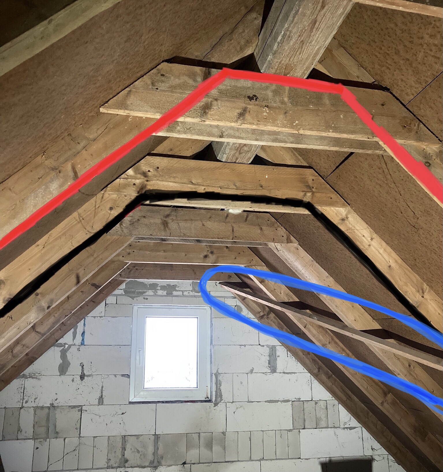 Soweit ich das einschätzen kann mit der " blauen Strebe " ist die nur da, damit die Schubkräfte vom Dachstuhl beim Einbau nicht zu groß sind das die Sparren nicht verutschen sozusagen.... eine Art Schablone in dem Bereich... die Kräfte vom Dach etc laufen ja mehr in Vertikaler Richtung.. und die Kräfte fängt der Rohbau etc dann ab.
