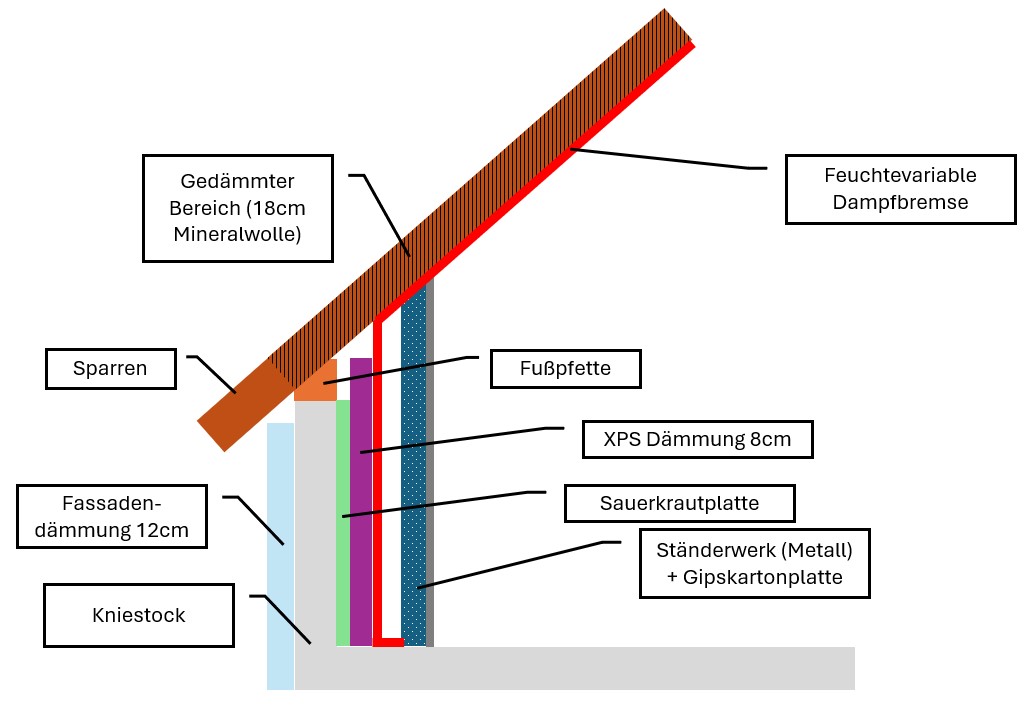 Wie Anschluss Dampfbremse an Fußpfette bzw. Kniestock?: Hallo mal wieder, wie würdet ihr den Anschluss der Dampfbremse von der Dachschräge kommend an die Fußpfette bzw. den Kniestock ausführen? Siehe... -