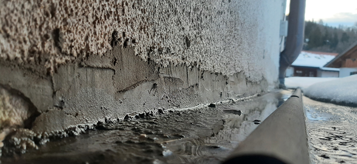 Oberhalb wurde nur Maleracryl verwendet, welches sich aufgelöst hat. Als Sofortmaßnahme wurde vor zwei Jahren das gröbste mit Fixzement verschlossen. Das hat etwas Zeit erkauft, ist aber sicher auch nicht fachmännisch.