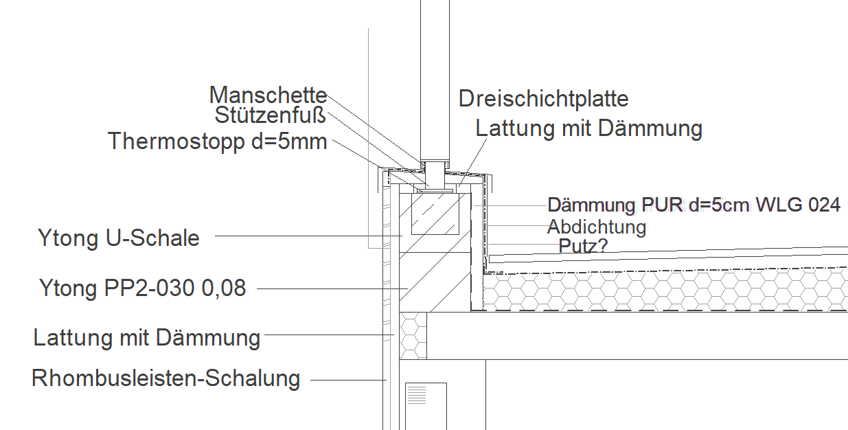 aktuell ist die Attika im Rohbau, d.h. noch keine Dämmung und Abdichtung (geplant Wolfin), nur die Dampfsperr-Schweißbahn auf der horizontalen Fläche + 10cm an der Attika-Wand (da hat der Dachdecker sich nicht an die Vorgaben gehalten, die vorgesehen hatten, dass die Schweißbahn bis OK Attika aber mindestens bis über die Höhe der horizontalen Dämmmung gehen soll, wird noch nachgebessert) Ursprünglich war geplant, die Verblechung bis zum Terrassenbelag herunterzuziehen, dem Bauherren wäre aber eine Putzoberfläche jetzt doch lieber. In den Regelaufbauten von gedämmten Attiken endet die Darstellung immer mit der Abdichtung als obere Lage... Bei Faserzement-/Wedi-Platten müsste die Dämmlage für die Lattung unterbrochen werden, gibt es da eine wärmetechnisch bessere Möglichkeit? Funktioniert WDVS auf Wolfin?