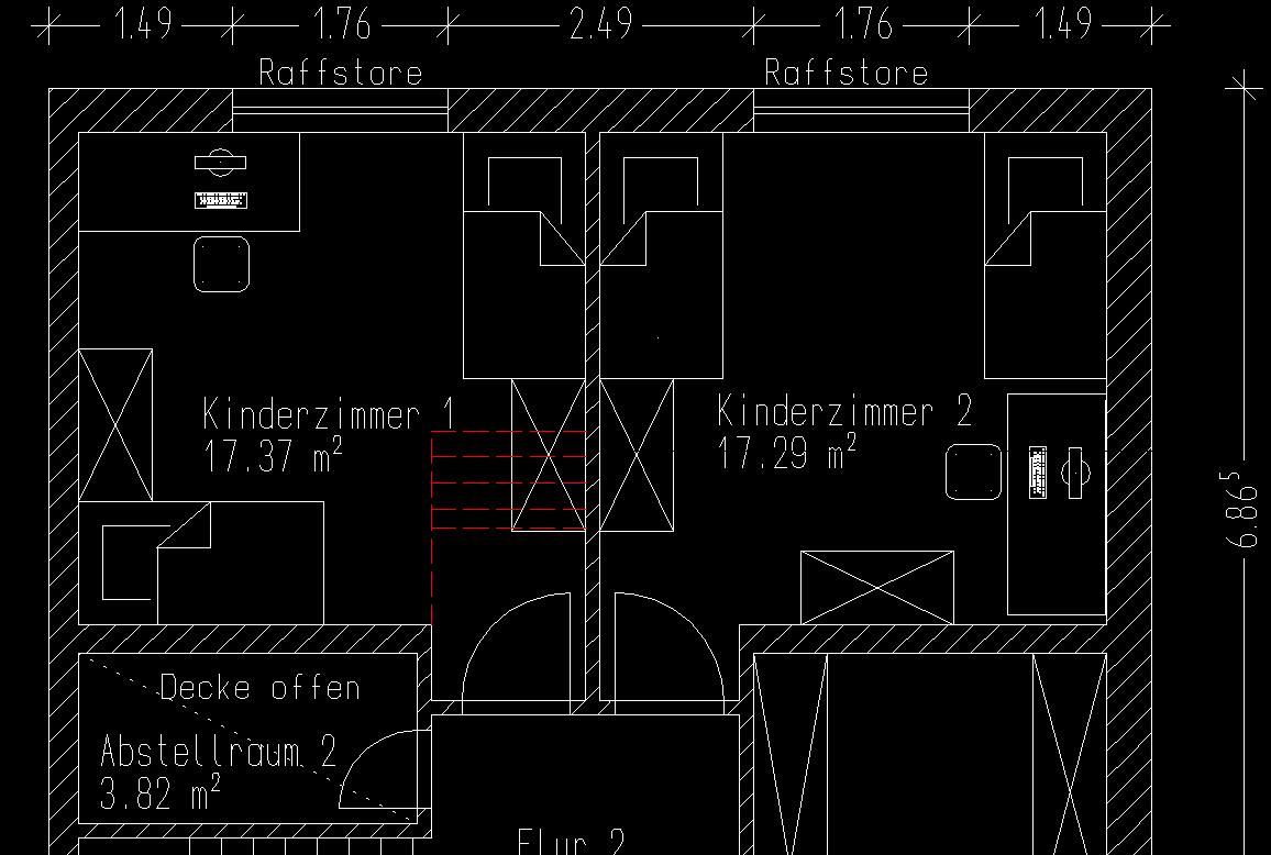 Hier der Grundriß Obergeschoss und mit Rot die Decke drüber + Treppe eingezeichnet (erst mal nur symbolisch).