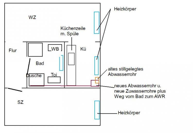 Anbei ein Grundriss meiner Wohnung, hoffe man kann es erkennen.. über jeder Heizung in WZ, SZ und Kü ist ein Fenster. Das Bad hat kein Fenster.