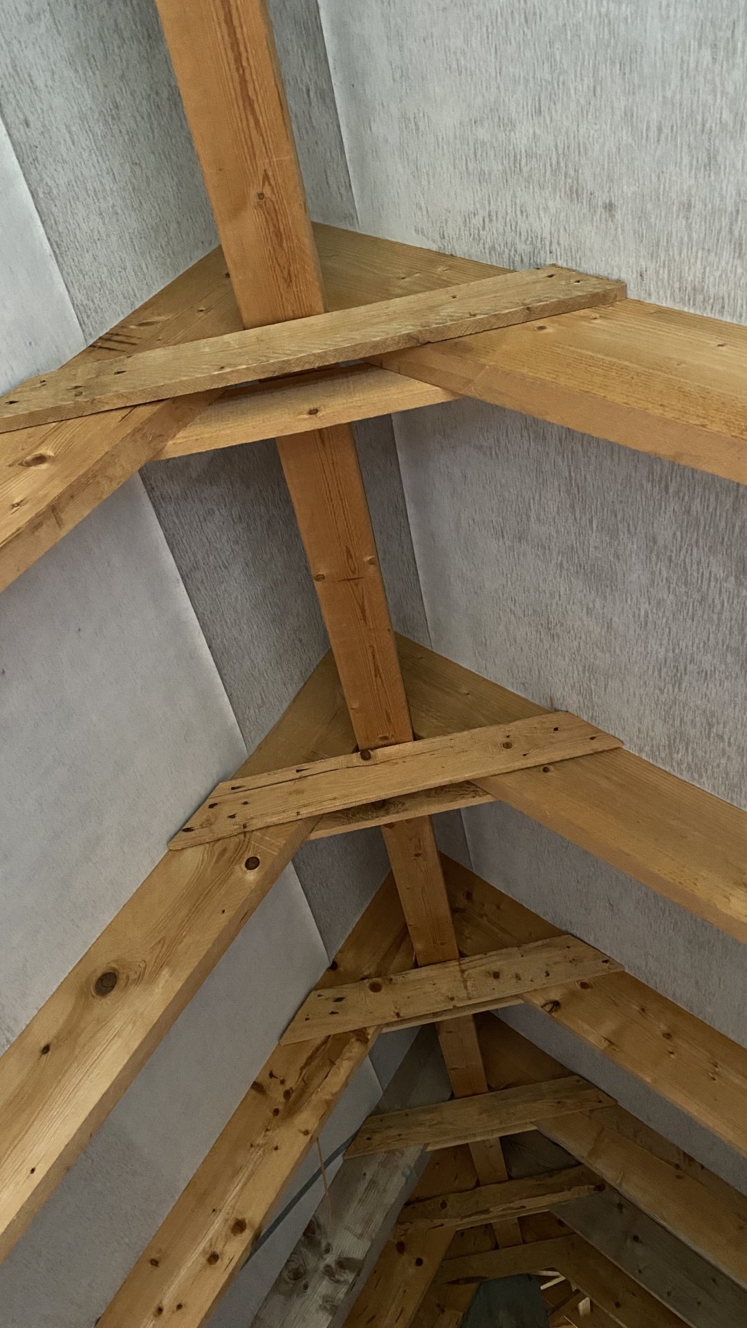 Das Sparrendach da ist bisschen schlampig gemacht. Ich sehe auf dem einen Bild oben das Licht zwischen den Sparren durchscheinen, die sind also da oben nicht direkt verbunden (überblattet oder was auch immer). Die sind mutmaßlich nur mit dem Querriegel verschraubt, also nur indirekt verbunden und das ist so nicht ganz richtig. Wie die verschraubt sind sieht man auch nicht. Was man sieht sind die Laschen, mal drei mal sieben Nägel, aber im Kreuz und quer…