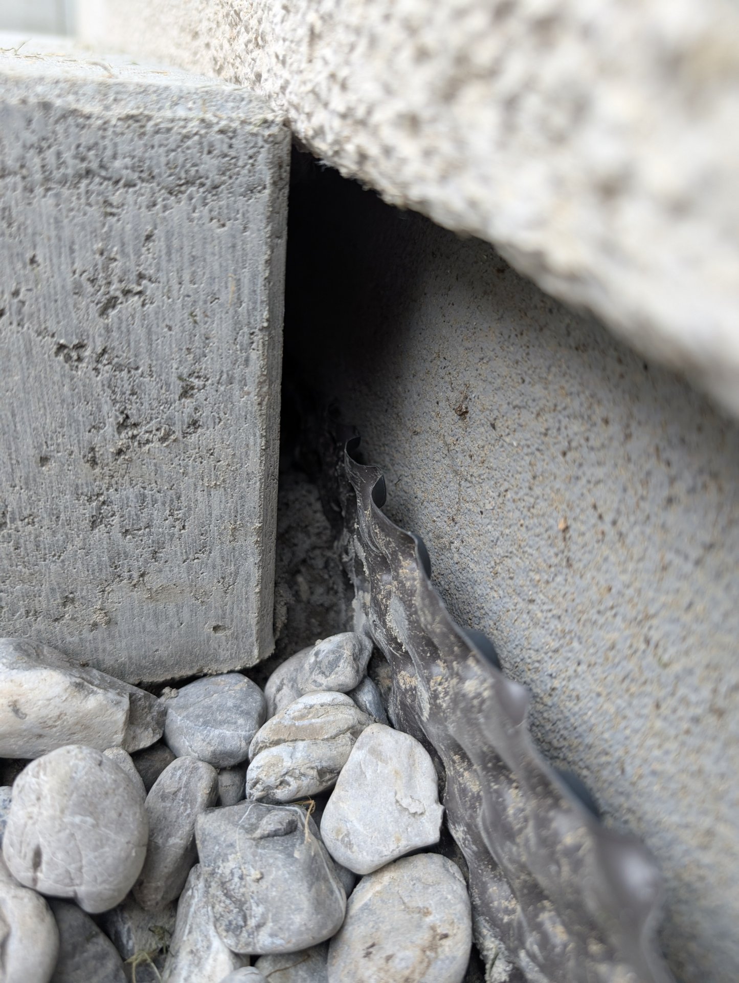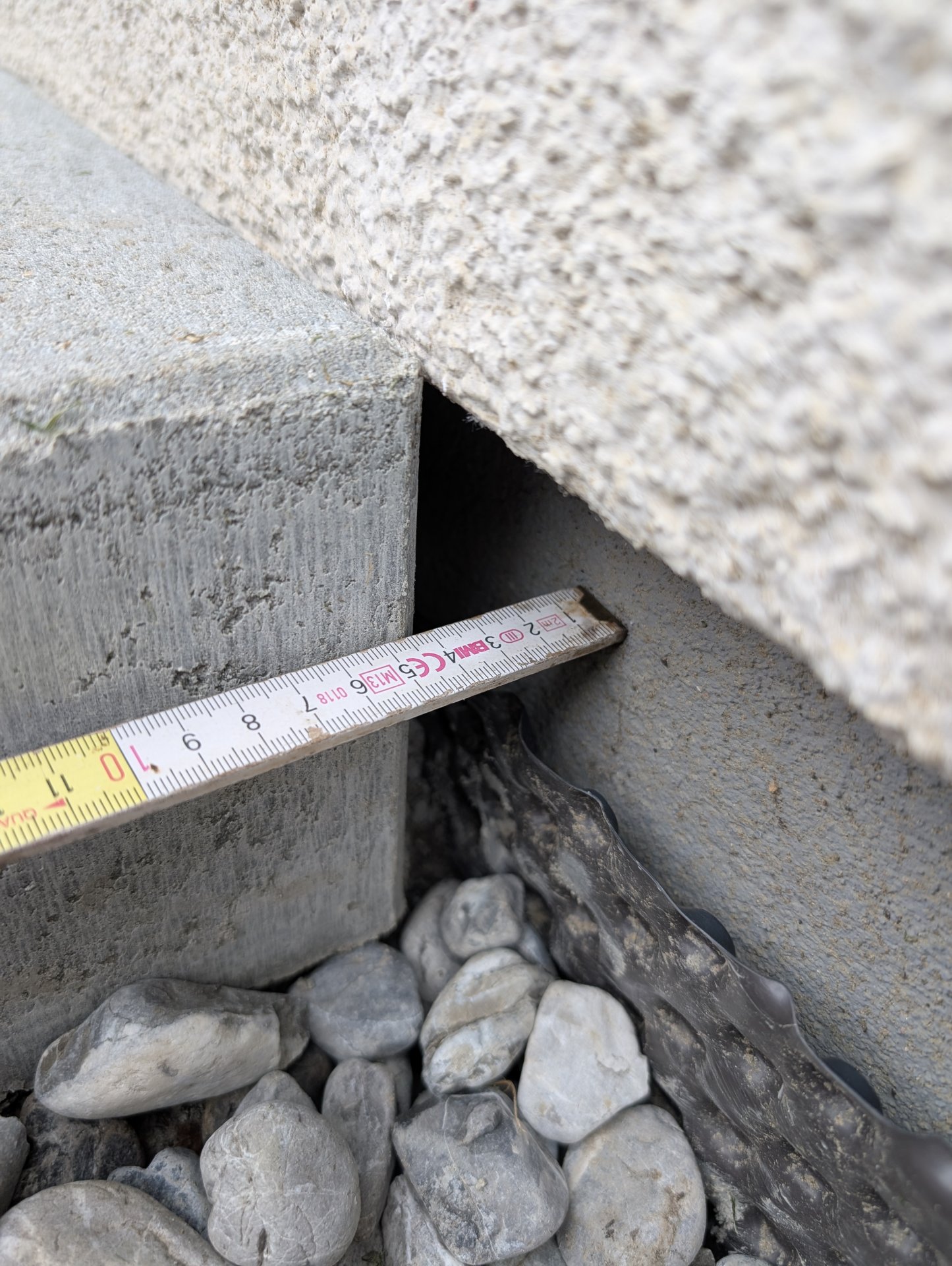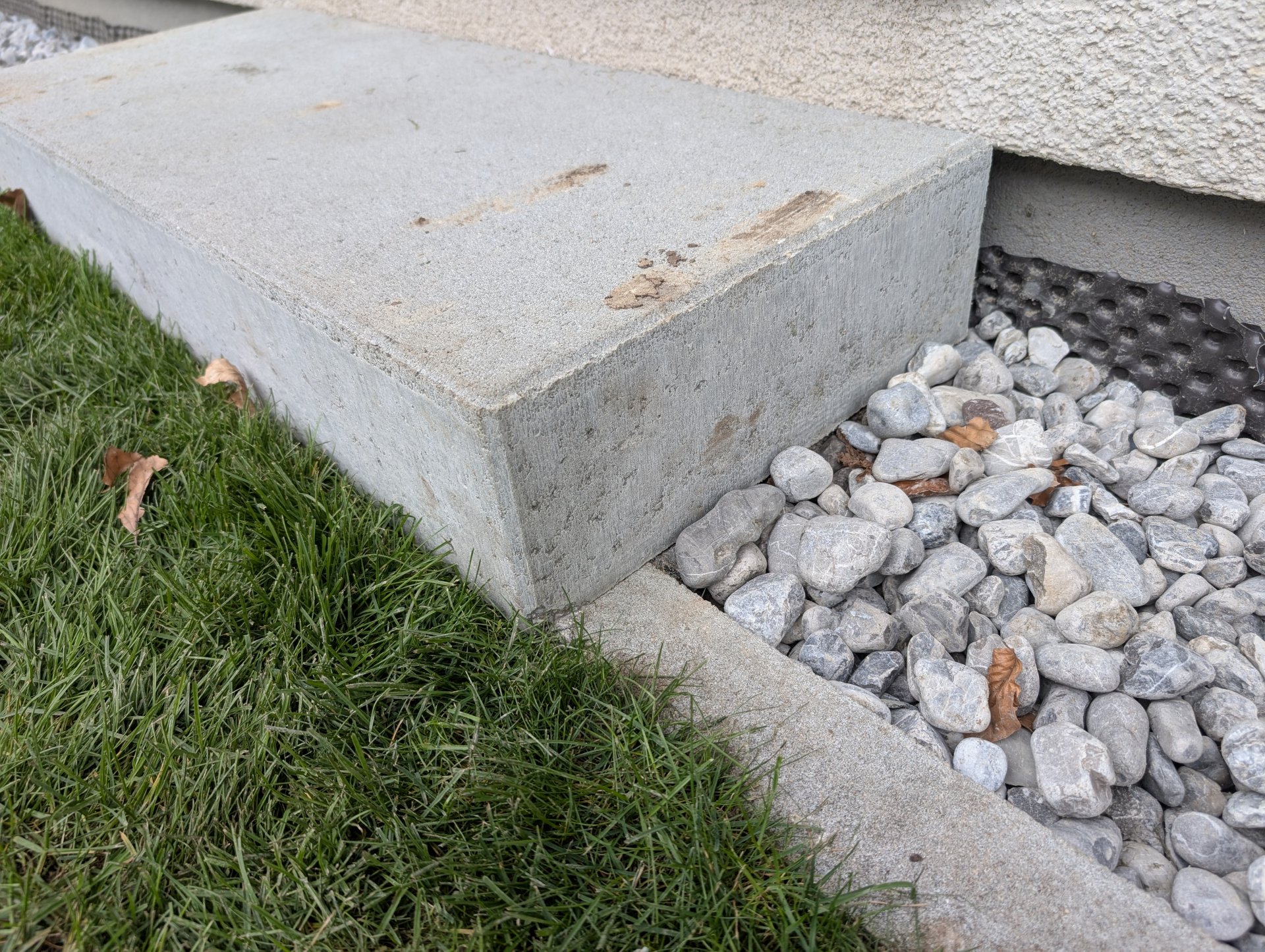 Hinter der Stufe am Sockelputz ist auch Noppenfolie angebracht. Die geht komplett ums Haus herum.