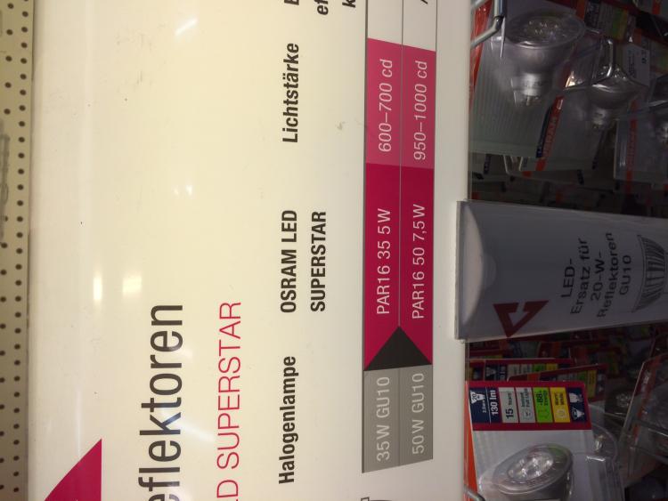 Ich hab in einer Miele Haube GU10 von Philips mit 4.2W verbaut. Die wirken heller als die (ge)alt(ert)en 50W Halogen. Allerdings könnte die Ausleuchtung vom Kochfeld (vordere Platte) etwas besser sein. Die Philips haben 36° Abstrahlwinkel.