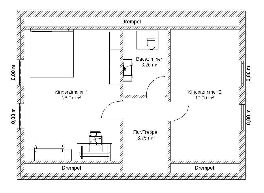 Das Bad im OG (ca. 6,26m²) soll ein WC, Dusche(alternativ Badewanne) und Waschtisch erhalten. Das Kinderzimmer 1 soll perspektifisch unser Schlafzimmer werden, wenn unsere Tochter später auszieht.