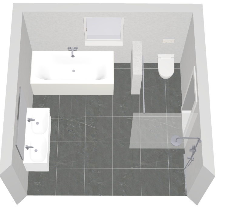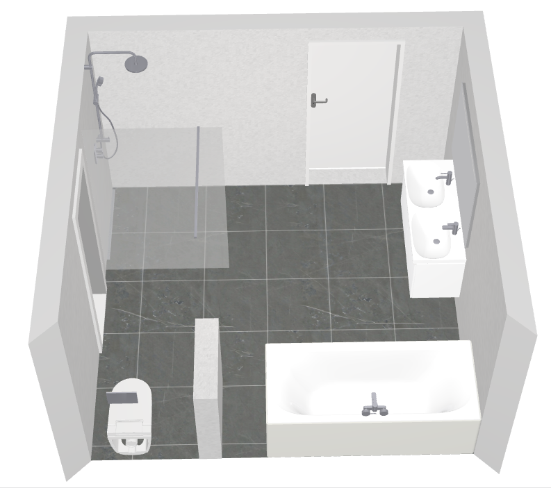 Angestrebt ist ein WC, Badewanne, Bodengleiche Dusche und Doppelwaschtisch.