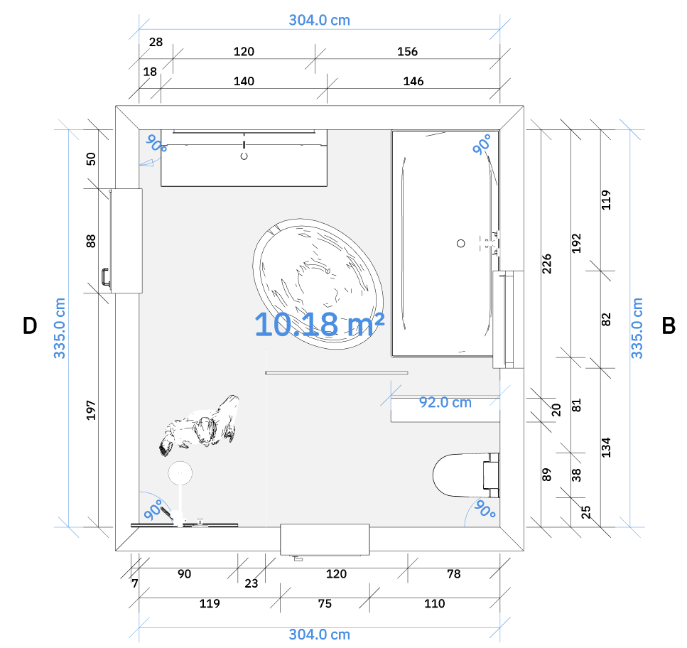 Die kurze Seite ist aber maximal 1,80m lang. Wenn ich da noch mindestens 10cm für eine Trockenbauwand abziehe bleibt nicht mehr viel für eine Badewanne und wirkt dann vermutlich gequetscht.