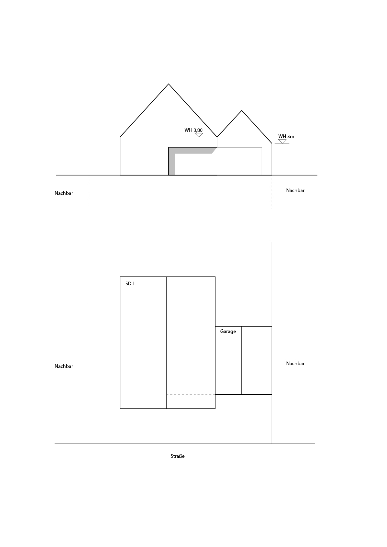 D.h. gem. der Skizze wäre die Garage (kein Aufenthaltsraum) noch privilegiert für die Grenzbebauung gem. BauO NRW trotz der einseitigen WH von 3,80? Wenn dem so ist: Schön!