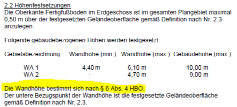 Was für mich bedeutet, dass die Wandhöhe so gemessen wird wie in der HBO, damit da kein Interpretationsspielraum ist. Ob das klug war, kann ich nicht bewerten. Z.B. wenn die HBO sich ändert. (verhält sich das dann wie mit der BauNVO ? das immer der damalige Stand gilt? hm. )
