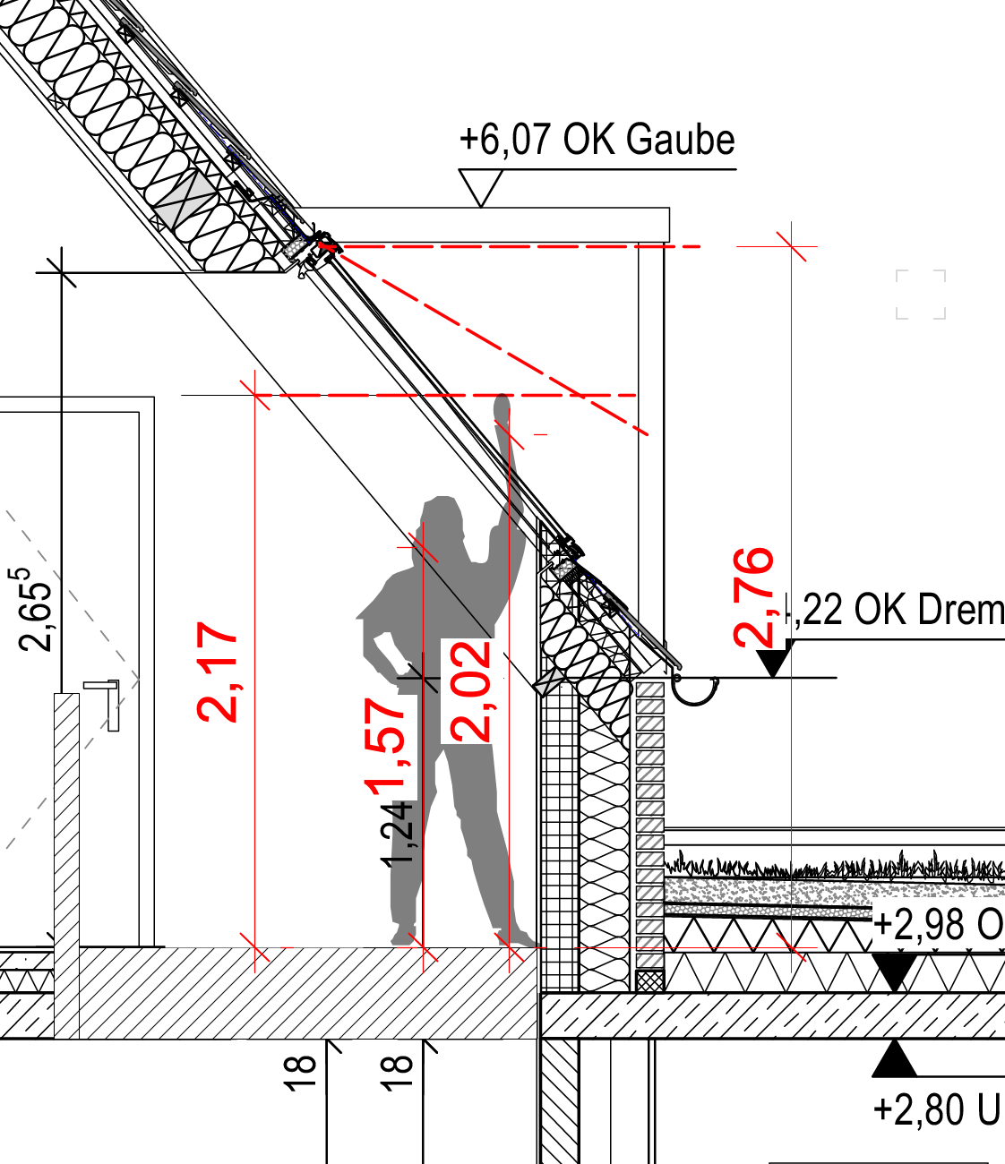 Durch die Dachdicke von fast 50cm, und dem Fakt dass wir unterhalb der Fenster eine Dachstein Reihe haben wollen, ergibt sich damit eine Höhe der Glasleiste der Dachfenster von 157cm, siehe Anhang.