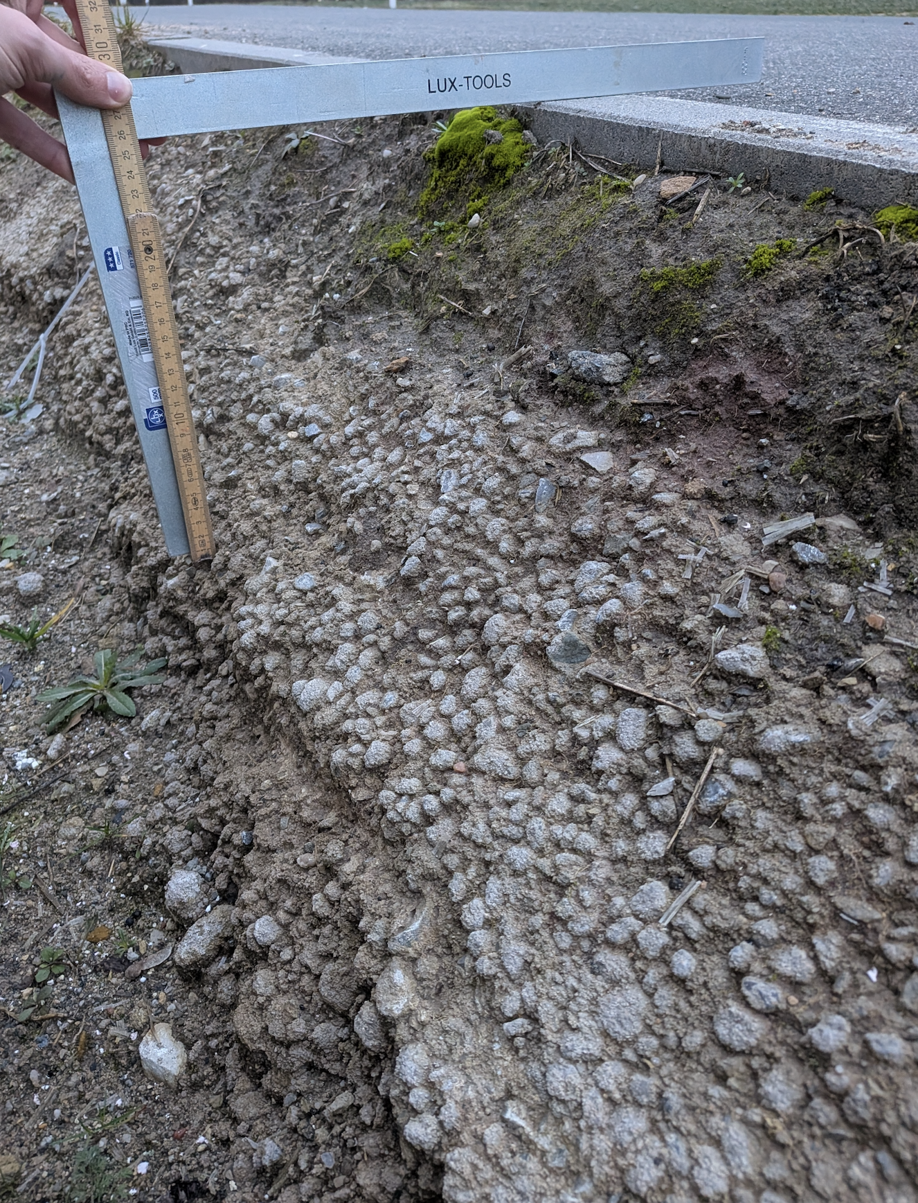 Eine Option wäre nun Material aus dem Fundament herauszuschlagen / flexen, um dann den Pfosten dort einbetonieren zu können. Bisher habe ich aber nicht herausgefunden wie tief das Fundament in den Boden ragt und weiß auch nicht, ob das rechtlich okay wäre bzw. wie es sich statisch auswirken würde.