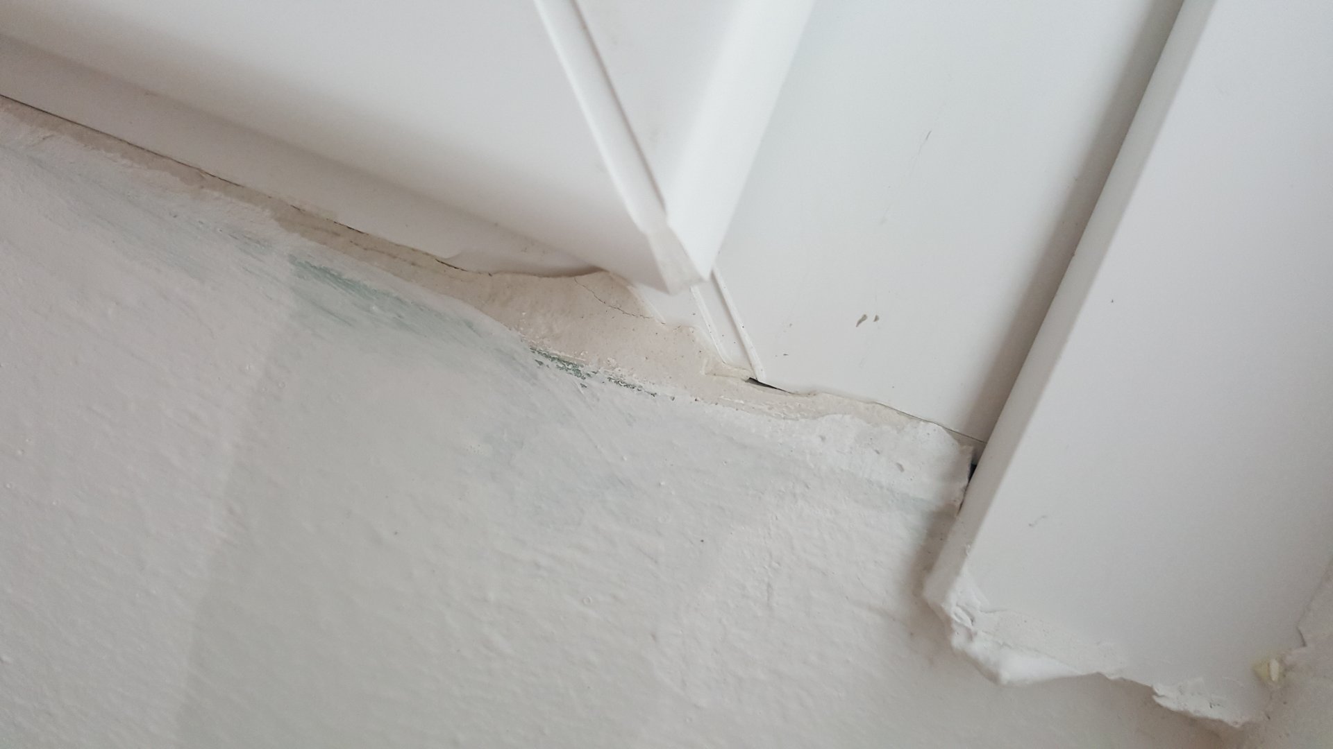 Anbei ein paar Fotos... laut Bauunternehmen und Fensterfirma ist das normal... auch diese langen aufgequellten Streifen an der Wand. Sieht das für euch echt normal aus?