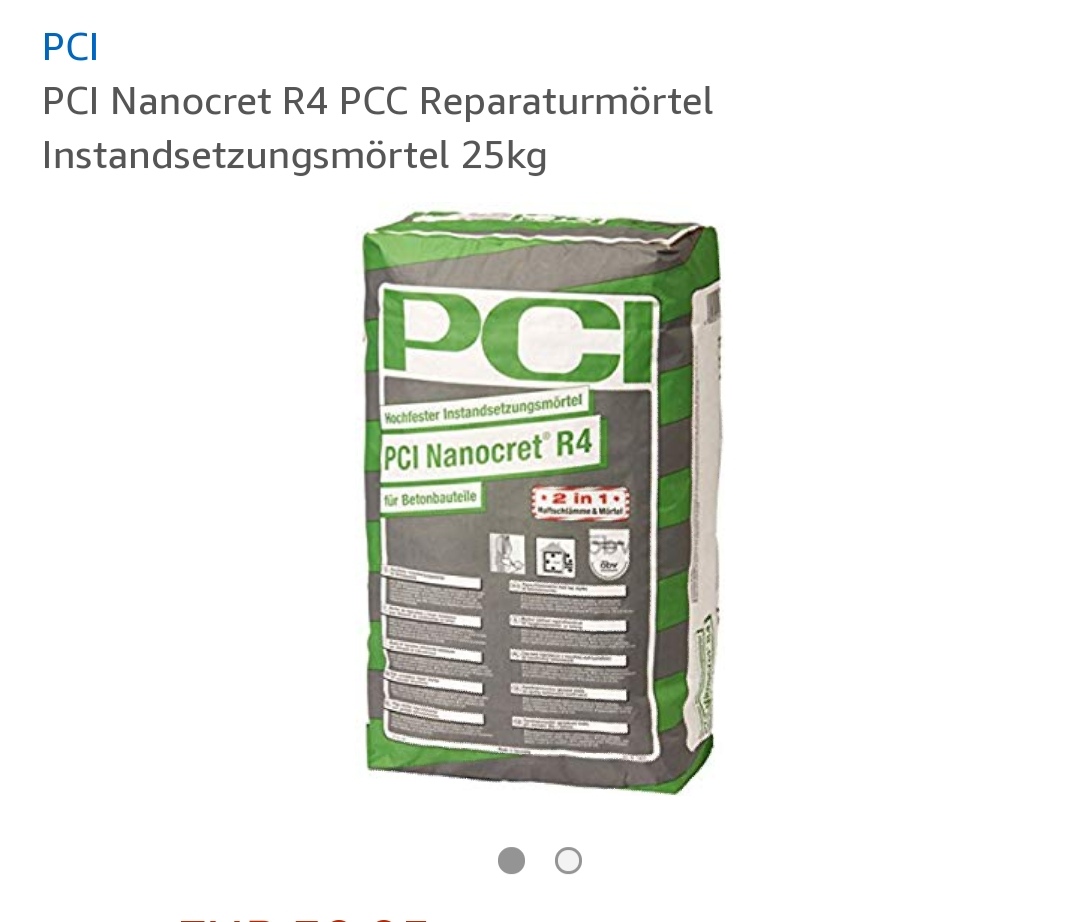 Erstmal 'kärchern' dann mechanisch 'schleifen' mit Schleifteller für Beton 'cleanen' nun kommt es etwas auf Ihren Anspruch an von Remmers pci gibt es verschiedene Reparaturmörtel exemplarisch pcc oder r3 r 4, Farbe aussen auf Beton ist immer etwas schwierig @Manufact hat vllt etwas auf Tasche:winken