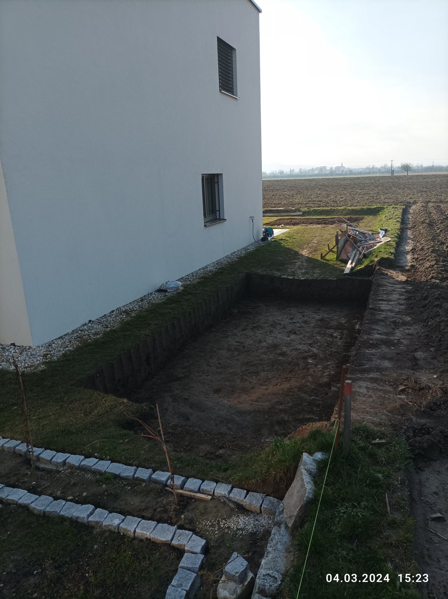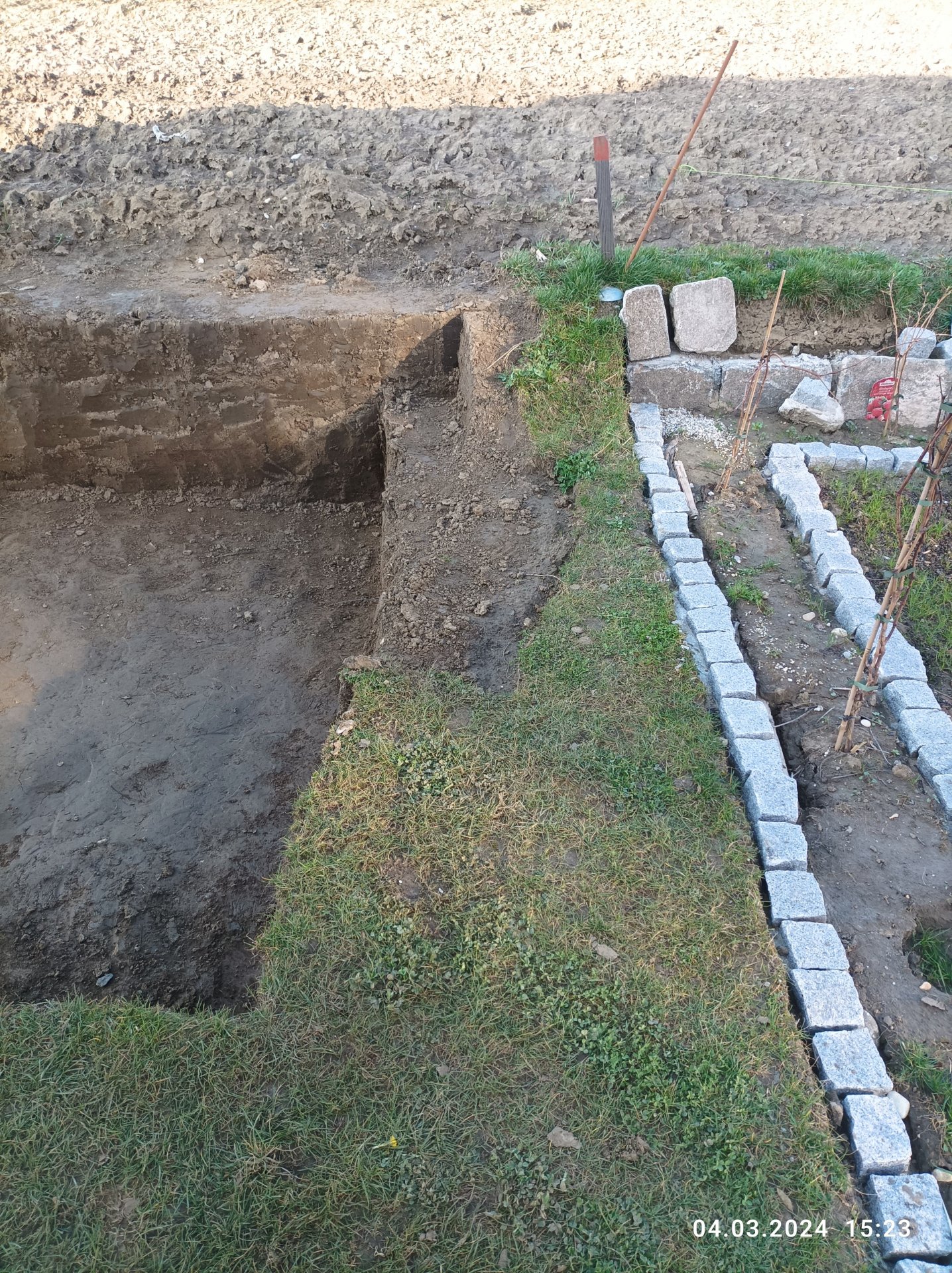 Auf der hinteren Böschungsseite würde ich 50cm in die Höhe gleich nass in nass mitschalen.Ach ja ich habe schweren festen Lehmboden.