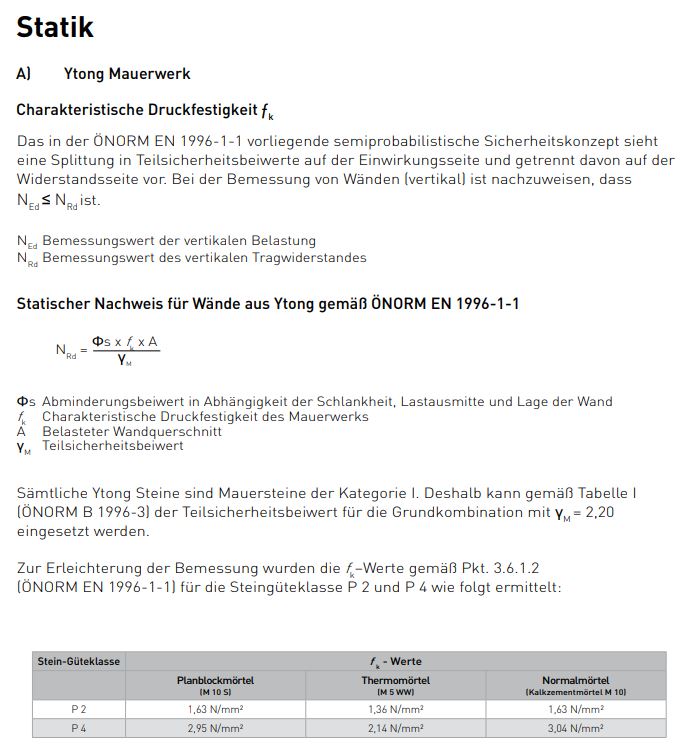 Im Dokument “Bautechnische Werte” von Ytong wird auf Seite 6 die Tragfähigkeitsberechnung für Ytong-Wände beschrieben (siehe Bild im Anhang).