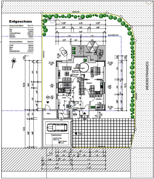 Haus 90 Grad drehen, den Flur zur Garage streichen, Garage 50cm breiter, das Haus 1m nach Norden schieben.