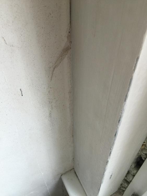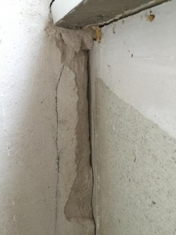 Ich dachte mir, den Kellenschnitt an den auf den Bildern zu sehenden Stellen nachträglich durch Abkratzen des Putzes von der Platte zu erzeugen, um so die beiden Wände voneinander zu entkoppeln. Doch wie gehts dann weiter? Nur mit Acryl ausfugen und anschließende jede Wand für sich überspachteln? Oder Gewebe aufkleben? Wenn ja, welches? Dieses knickbare Papiergewebe für Innen-/Außenecken oder einfache Armierung oder Panzerarmierung? Wie soll ich den Riss in der Fenstersturzverkleidung behandeln? Die Vertikale Verkleidung steht min. 3 Millimeter ab.