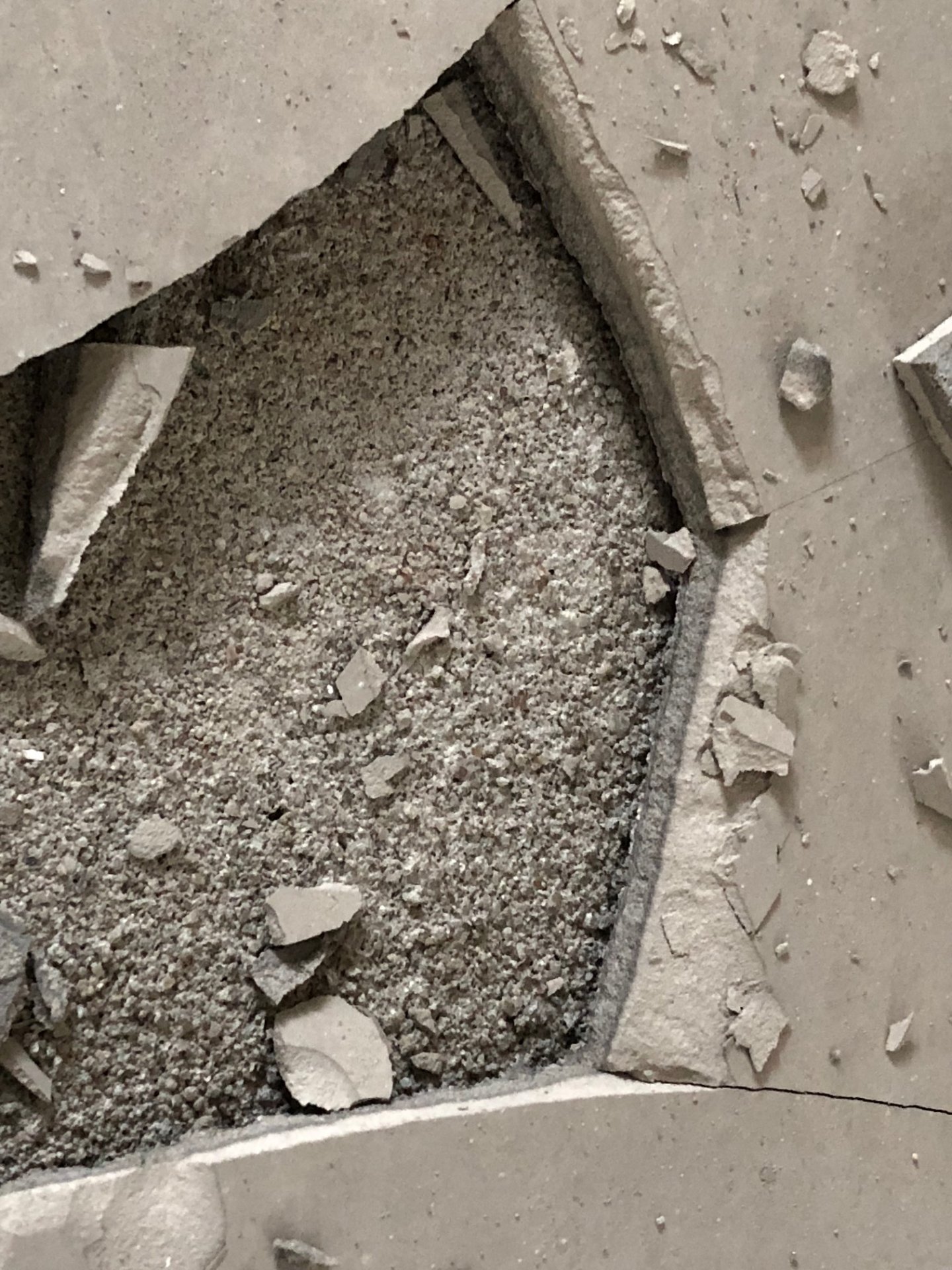 Die Aussage des Ardex Mitarbeiters ist, dass sich eine vorherige Ausgleichsmasse nun vom Estrich gelöst hat.