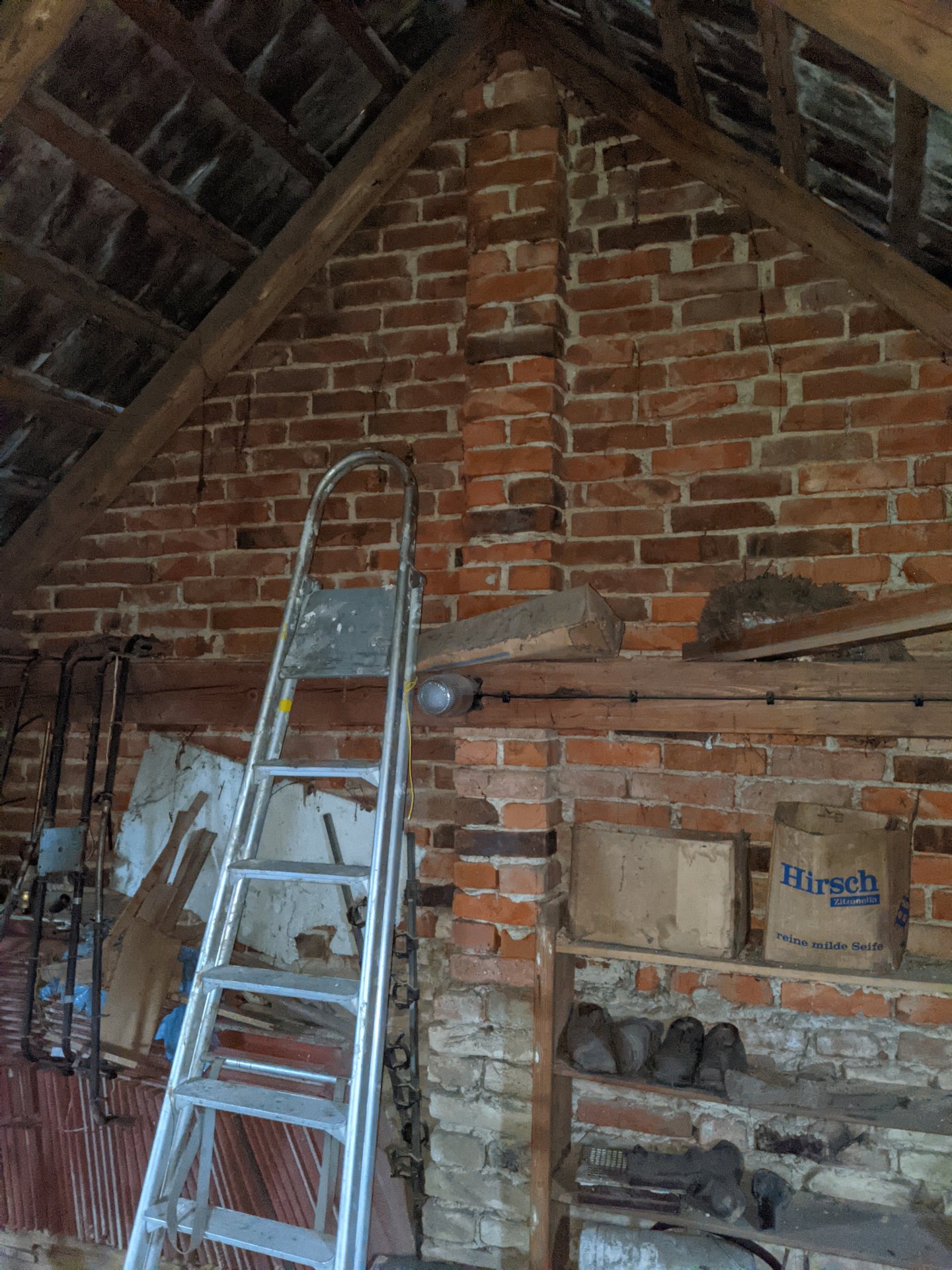 Die Brandmauer verputzen ich natürlich im Frühjahr auf der Dachstuhl Seite noch mit Mörtel, da der alte Mörtel in den Fugen schon teilweise bröselt.