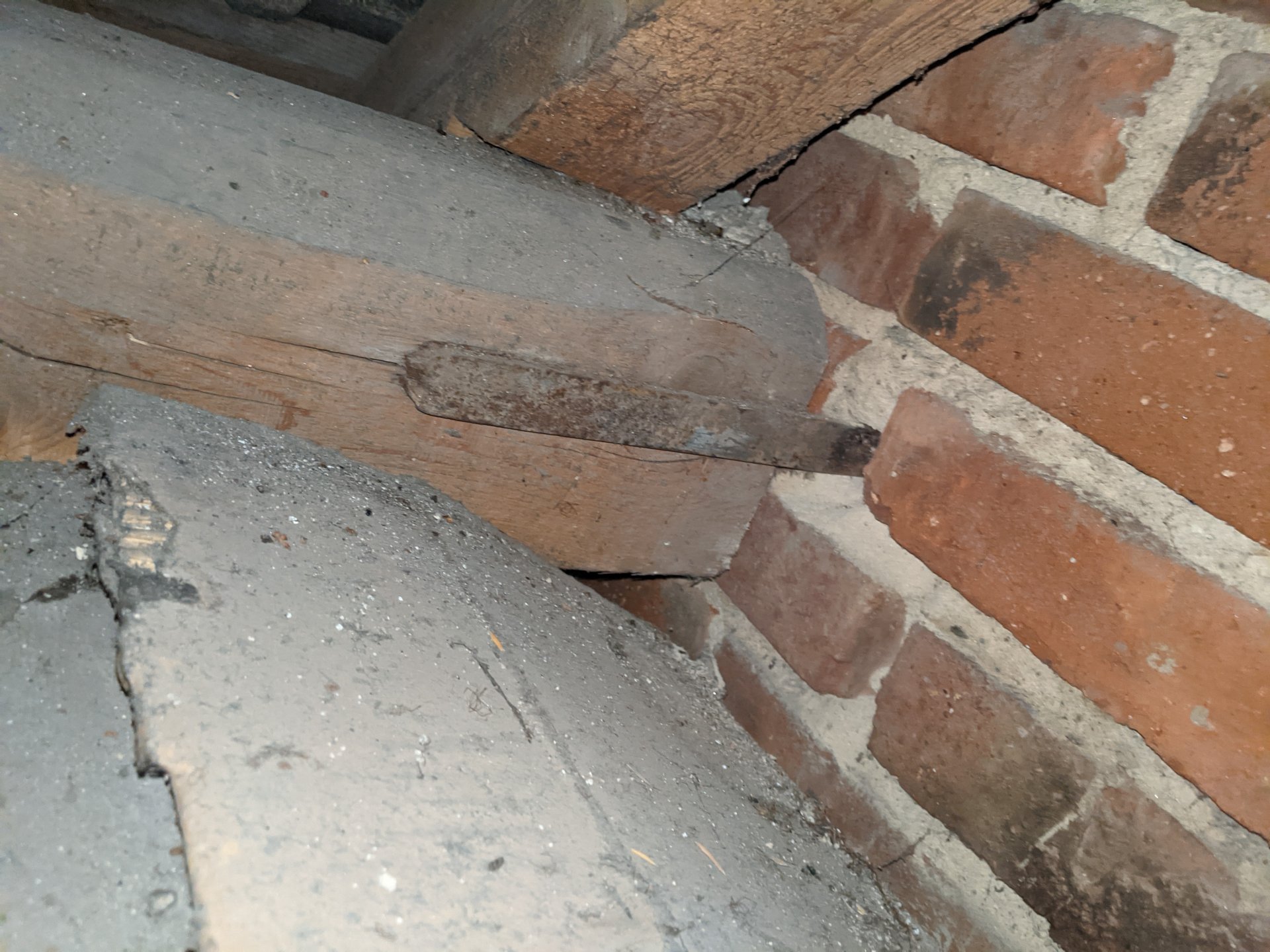 Es ist außerdem ein Metall auf jeder Seite der Mittelpfette des Dachstuhls befestigt, das durch die Mauer geht.
