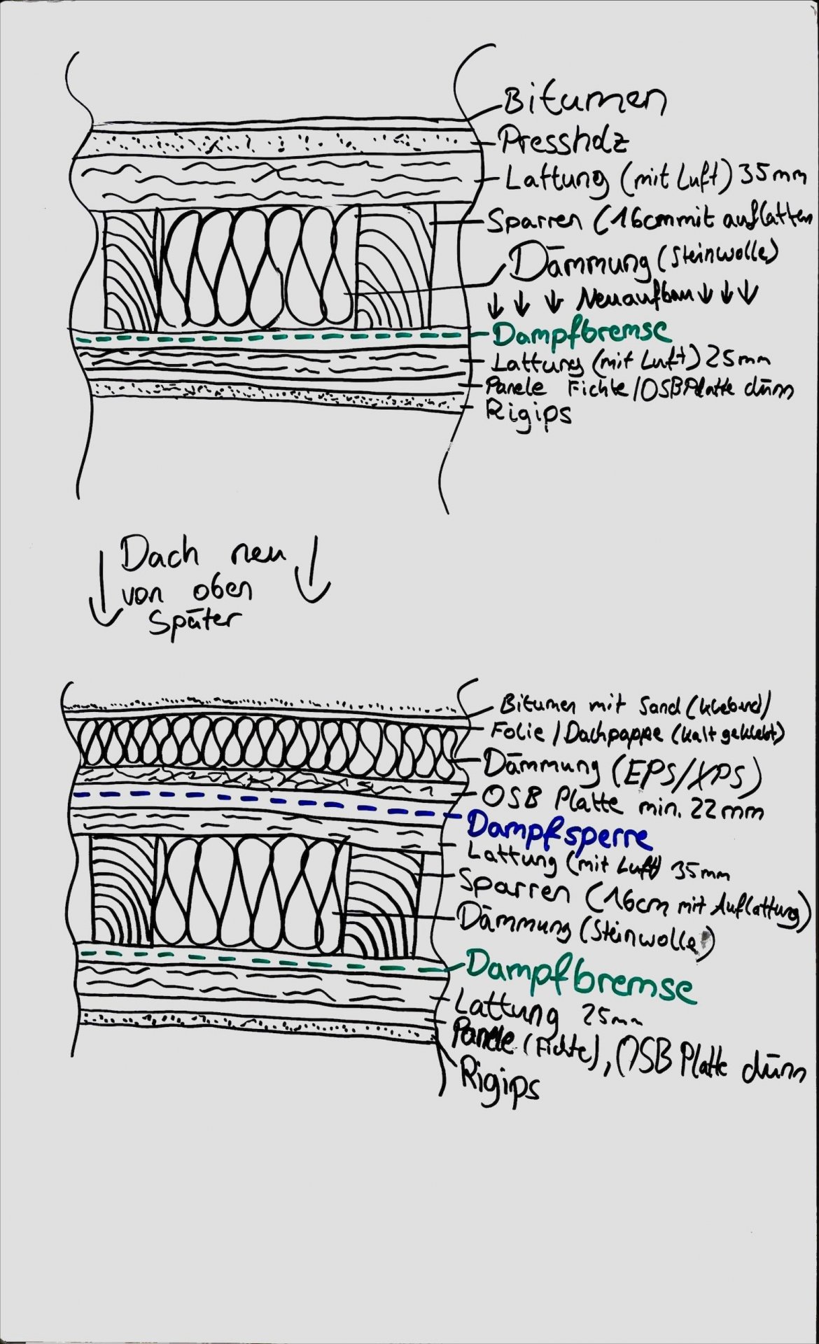 Dachaufbau im OG bei vorhandener Aufsparrendämmung – Dämmung von unten: Guten Tag zusammen, wir haben vor kurzem ein Haus gekauft und sind aktuell mitten in der Renovierung. Im Dach ist bereits eine Aufsparrendämmung... -