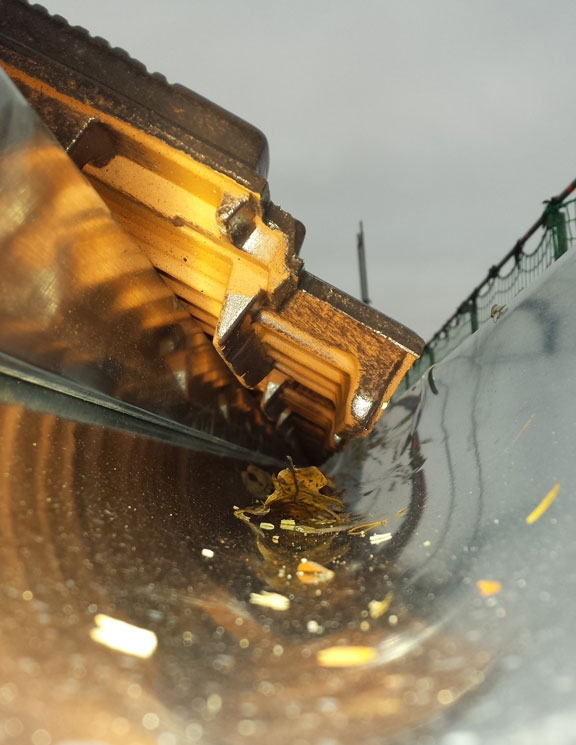 Hier sieht man auch nochmal sehr gut wie tief der Dachziegel in der Regenrinne steckt.