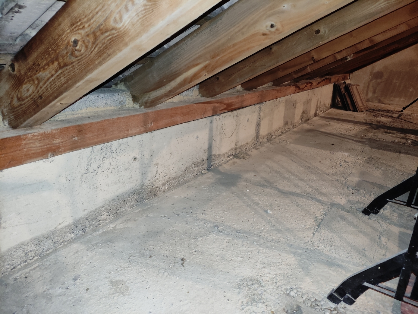Aktuell ist innenseitig als Raumabschluss der Kniestock (ca. 40cm hoch) auf dem die Fusspfette liegt (siehe Foto). Die Mauerstärke beträgt wie bei den restlichen Aussenwänden 24cm (ungedämmt). In 3-5 Jahren soll eine Aussendämmung erfolgen.