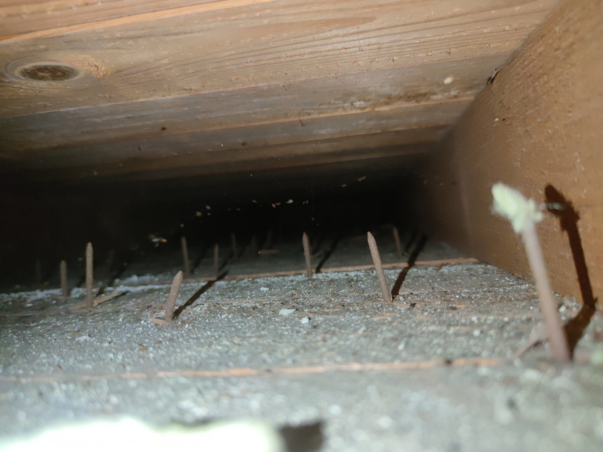 Ich habe ein Haus von 1963 mit Kaltdach. Die oberste Geschossdecke ist aktuell noch nicht gedämmt. Sie besteht aus den Kehlbalken und drunter und drüber sind Bretter genagelt. So ergeben sich Hohlräume von ca. 12cm Dicke. Leider gibt es keine Dampfbremse/-sperre. Zudem sind die Hochräume von Nägeln gespickt (siehe Bild).