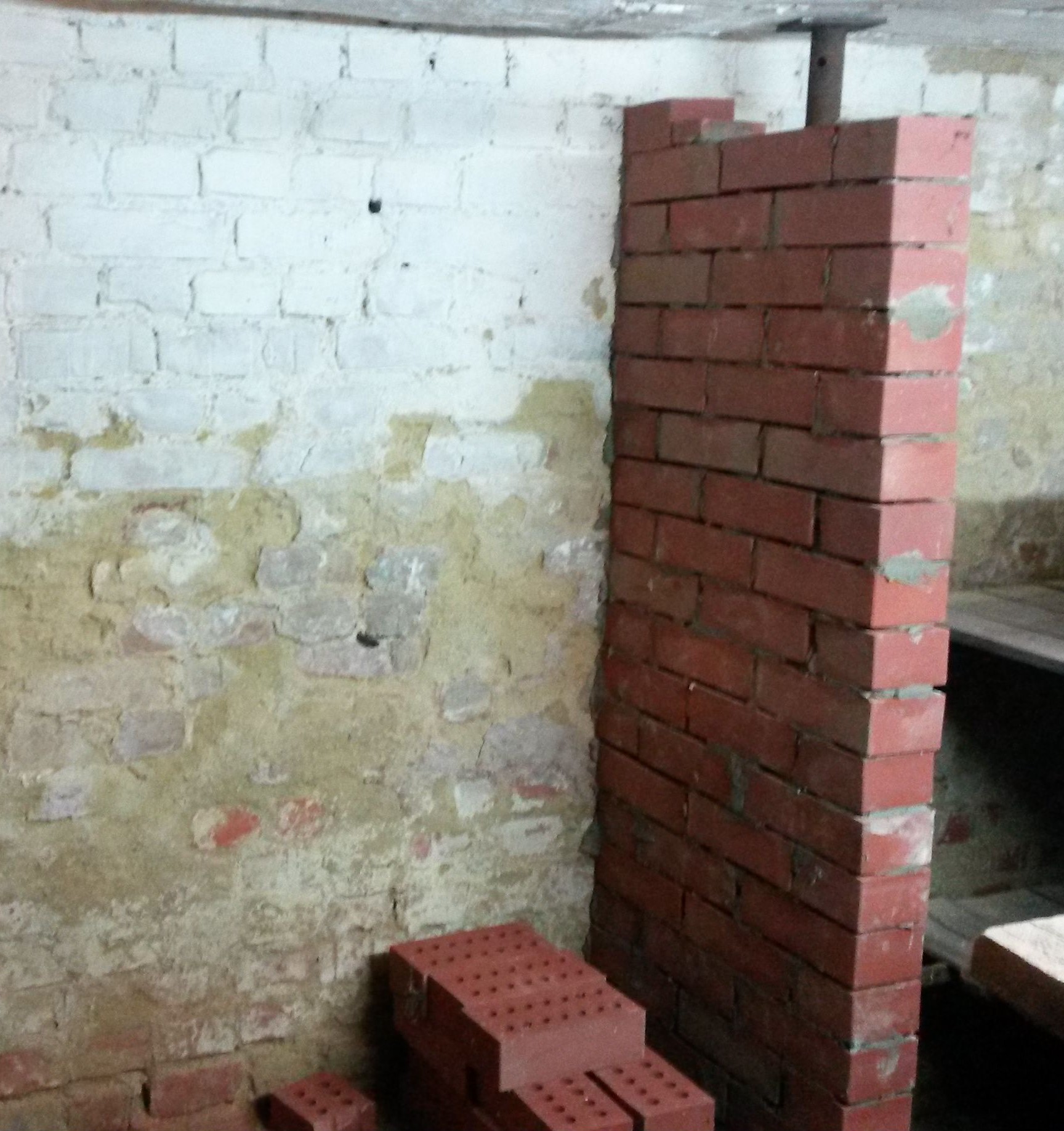 Hier mein Problem: Die Kellerdecke in einem Eck des Wohnhauses neigt sich nach unten, die Ziegel bekommen Risse (der frühere Eiskeller des Hauses) . Zunächst mal mit einem Sprieß und Bauholz abgestützt.