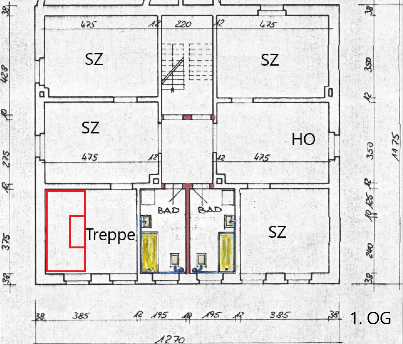 Die Mieter im 2. OG benötigen also das Treppenhaus um zur Wohnung zu kommen. (ext. Zugang über eine Außentreppe halte ich für schwierig)