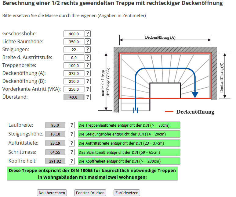 Wir haben uns über den Treppenrechner für DIN 18065 Treppen eine Treppe konfiguriert. Geschosshöhe ca. 4 m, der Durchbruch hätte ca. Maße von 375x210 cm.
