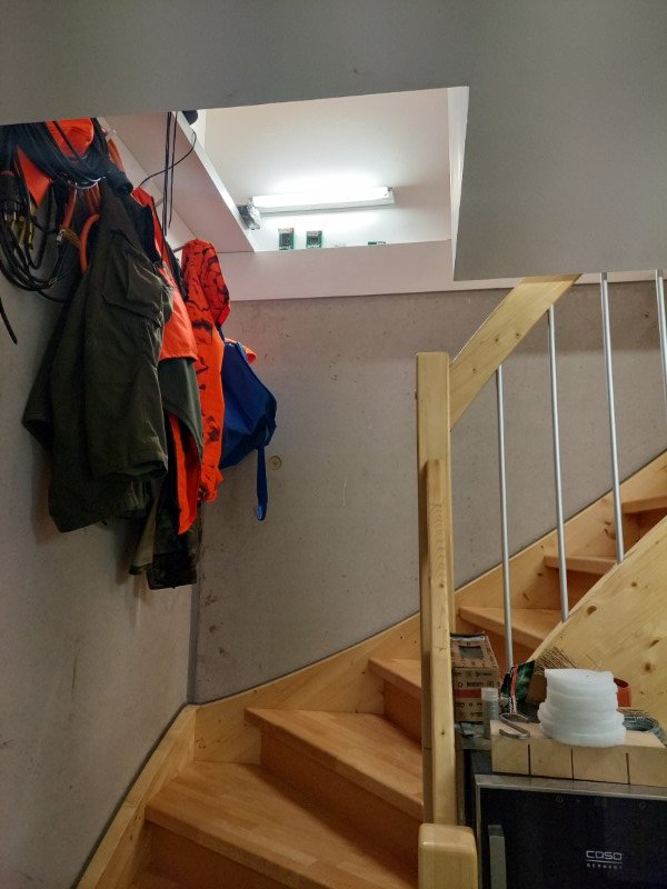 Die Steuerung der Hebeanlage liegt im Bereich des roten Kreises. Die Pumpe unten im Sockel. Die Rückstauebene liegt ca. 30cm über der gezeigten Betondecke im Bild. Direkt oben drüber liegt der Hausflur.