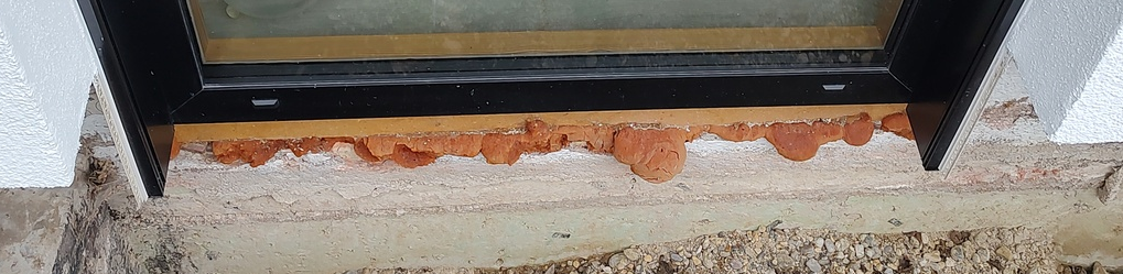 Zu sehen ist: Neues Fenster auf Purenit, mit PU-Schaum, der schon deutlich gelitten hat unterhalb die Betondecke zwischen EG/KG und rechts und links die alte Fassade mit Putz.