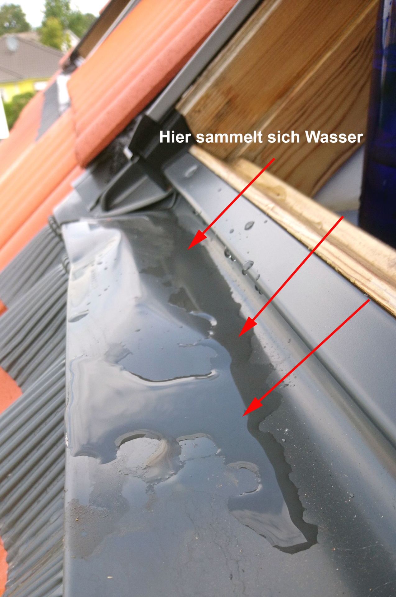 bei uns wurden das Dach neu gedeckt (die selben Betonsteine wie vorher). Die Dachfenster blieben drin. Nun stellen wir fest, dass die erste Ziegelreihe unter den Fenstern offenbar jetzt so dicht am Rahmen ist, dass der Blechlatz unten am Rahmen (ich kenne leider den Fachbegriff nicht) gar kein Gefälle mehr hat. Teilweise hat er sogar ein negatives Gefälle, dh. bei Regen läuft das Wasser nicht ab, sondern sammelt sich in der entstandenen Blechmulde (siehe Foto). Er wurde offenbar stark nach oben gedrückt, damit die Ziegel drunter passen.